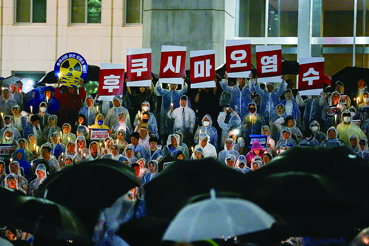 8月23日,在韩国首尔的国会议事堂前,韩国最大在野党共同民主党举行集会抗议日本政府决定启动核污染水排海。 新华社发