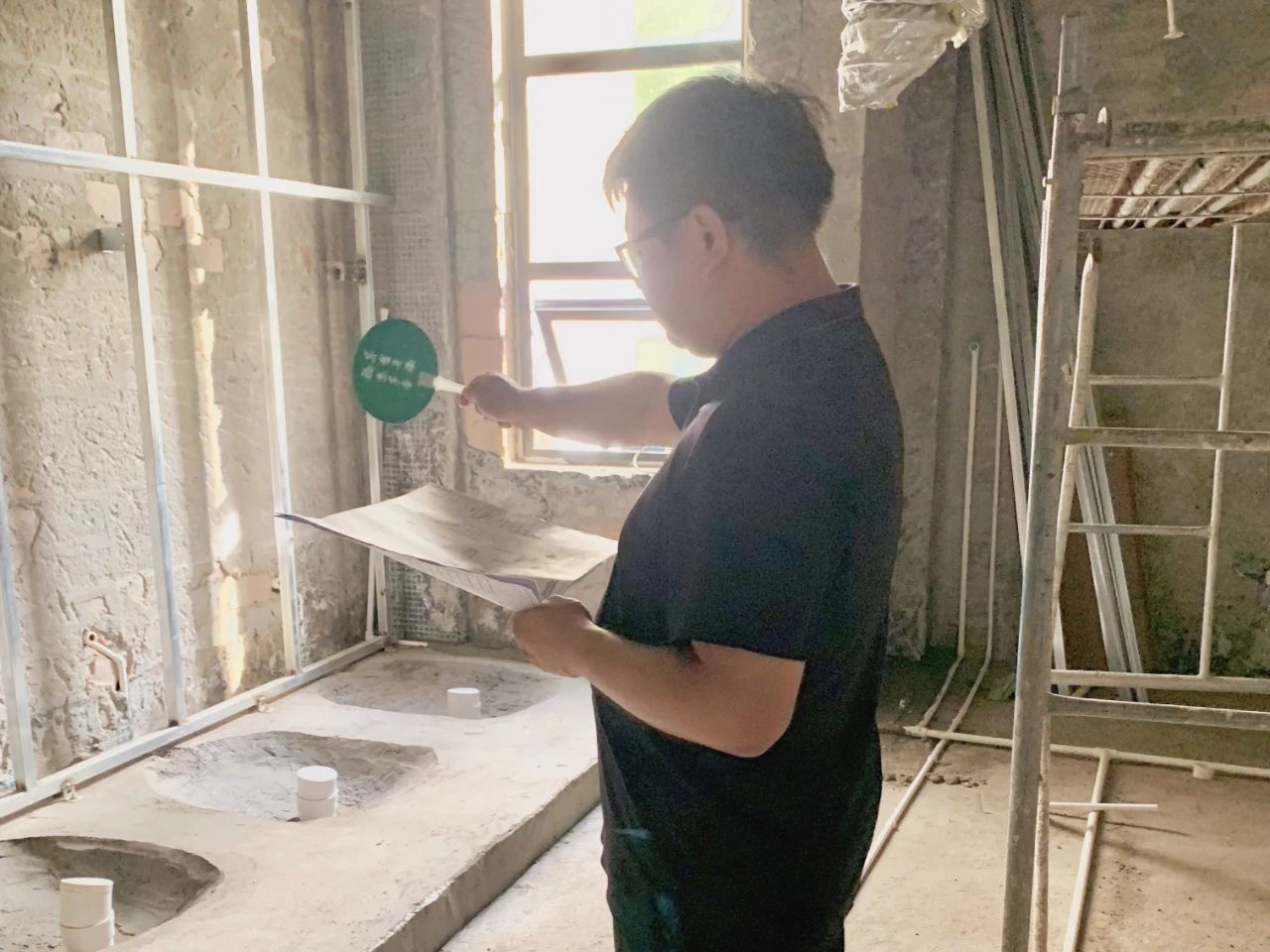 人物:千金药业生产设备部颜志品 地点:千金药业办公楼 感受:假期坚守岗位,守着改造洗手间现场,用“千金是福”扇子扇扇风,凉快多啦!