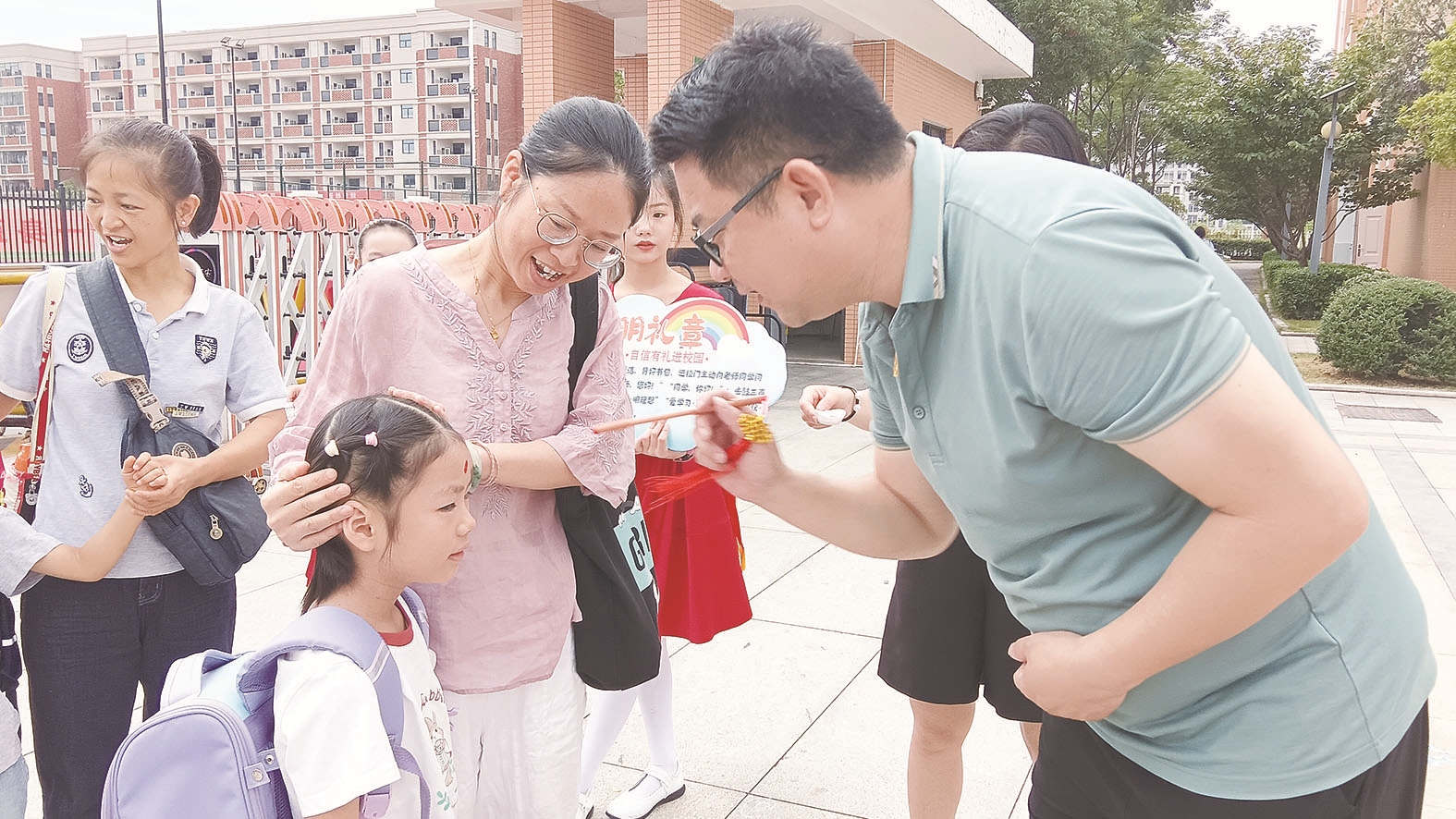 右图:市二中枫溪学校小学部,学校老师为一年级新生点朱砂启蒙。 记者/李支国 摄