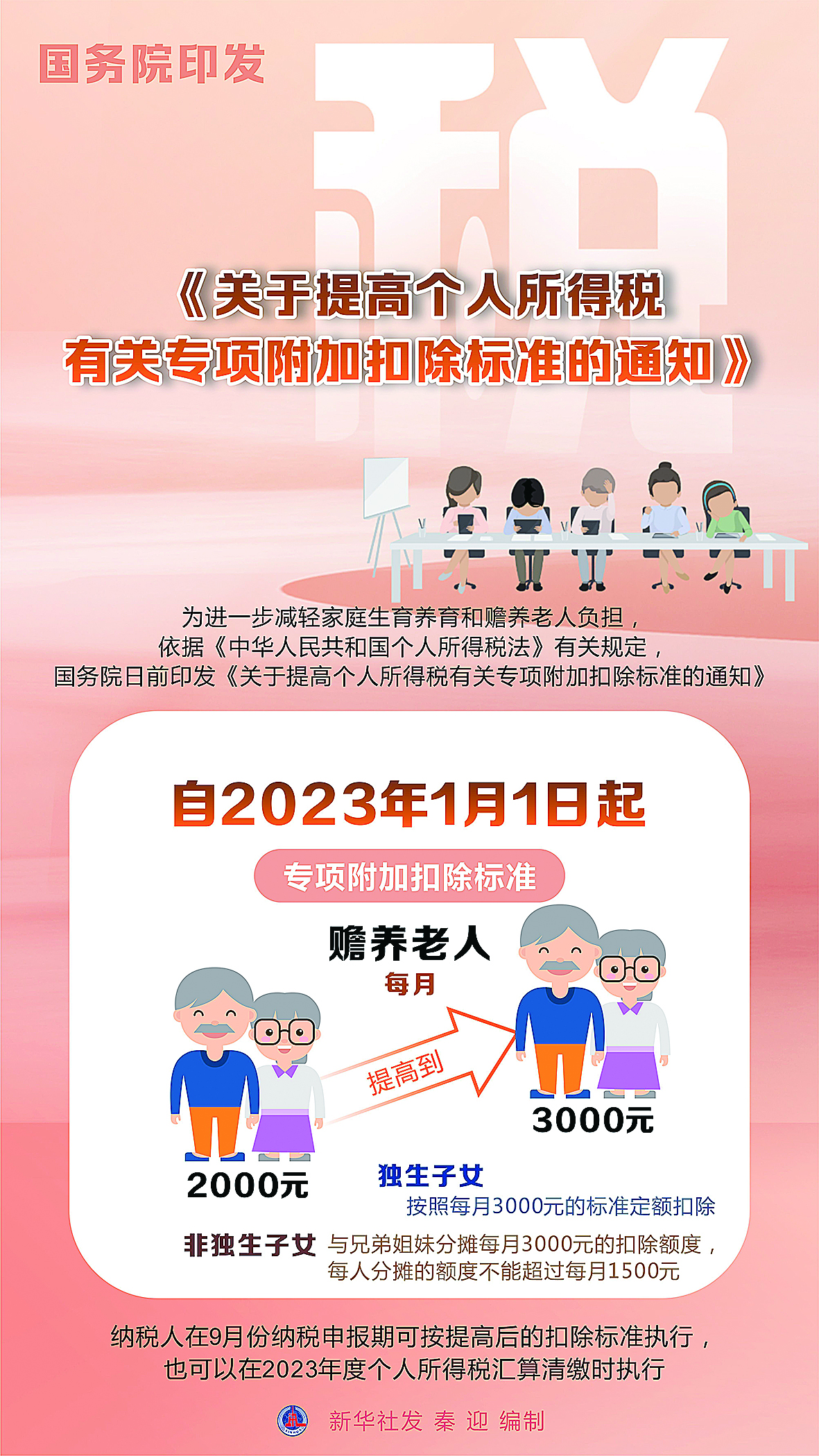 新华社北京8月31日电 为进一步减轻家庭生育养育和赡养老人负担,依据《中华人民共和国个人所得税法》有关规定,国务院日前印发《关于提高个人所得税有关专项附加扣除标准的通知》,决定提高3岁以下婴幼儿照护、子女教育、赡养老人个人所得税专项附加扣除标准。自2023年1月1日起,3岁以下婴幼儿照护专项附加扣除标准,由每个婴幼儿每月1000元提高到2000元;子女教育专项附加扣除标准,由每个子女每月1000元提高到2000元;赡养老人专项附加扣除标准,由每月2000元提高到3000元,其中独生子女按照每月3000元的标准定额扣除,非独生子女与兄弟姐妹分摊每月3000元的扣除额度,每人分摊的额度不能超过每月1500元。通知发布后,纳税人在9月份纳税申报期可按提高后的扣除标准执行,也可以在2023年度个人所得税汇算清缴时执行。
