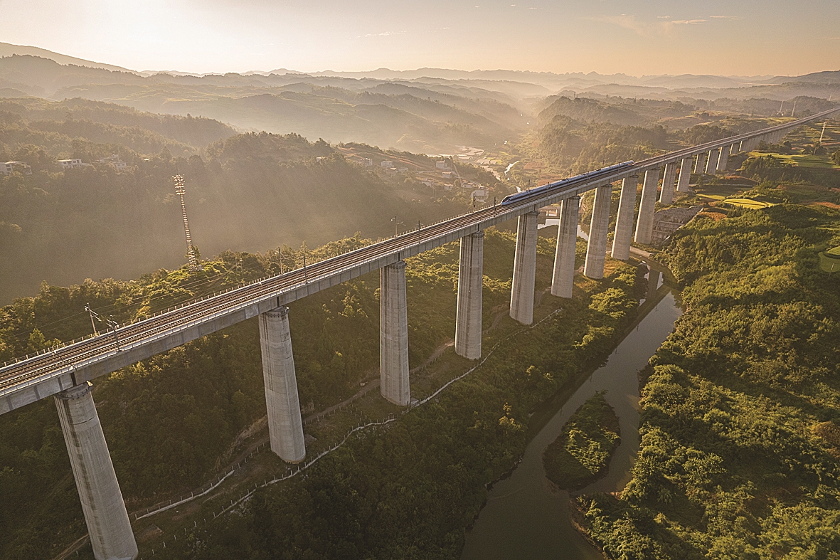8月31日,一列动车组在晨曦中经过位于贵州省独山县郊外的贵南高铁银坡河特大桥(无人机照片)。