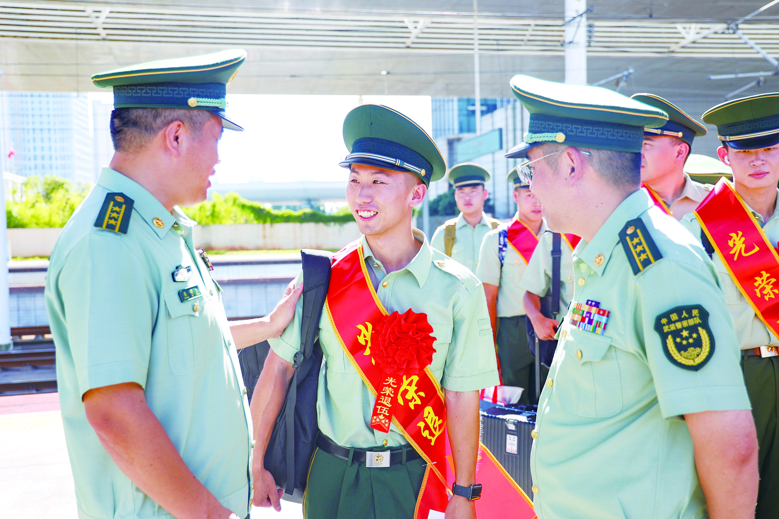 在嘹亮的口令声中,全体退役士兵凝神肃立,面对武警部队旗昂首挺胸、奋力举起右手,向武警部队旗敬上最后一个军礼,向军旅生涯告别。仪式结束后,继续服役的战友欢送退伍老兵前往车站,踏上返乡之旅;祝福脱下戎装的战友一路多珍重,再启新征程。