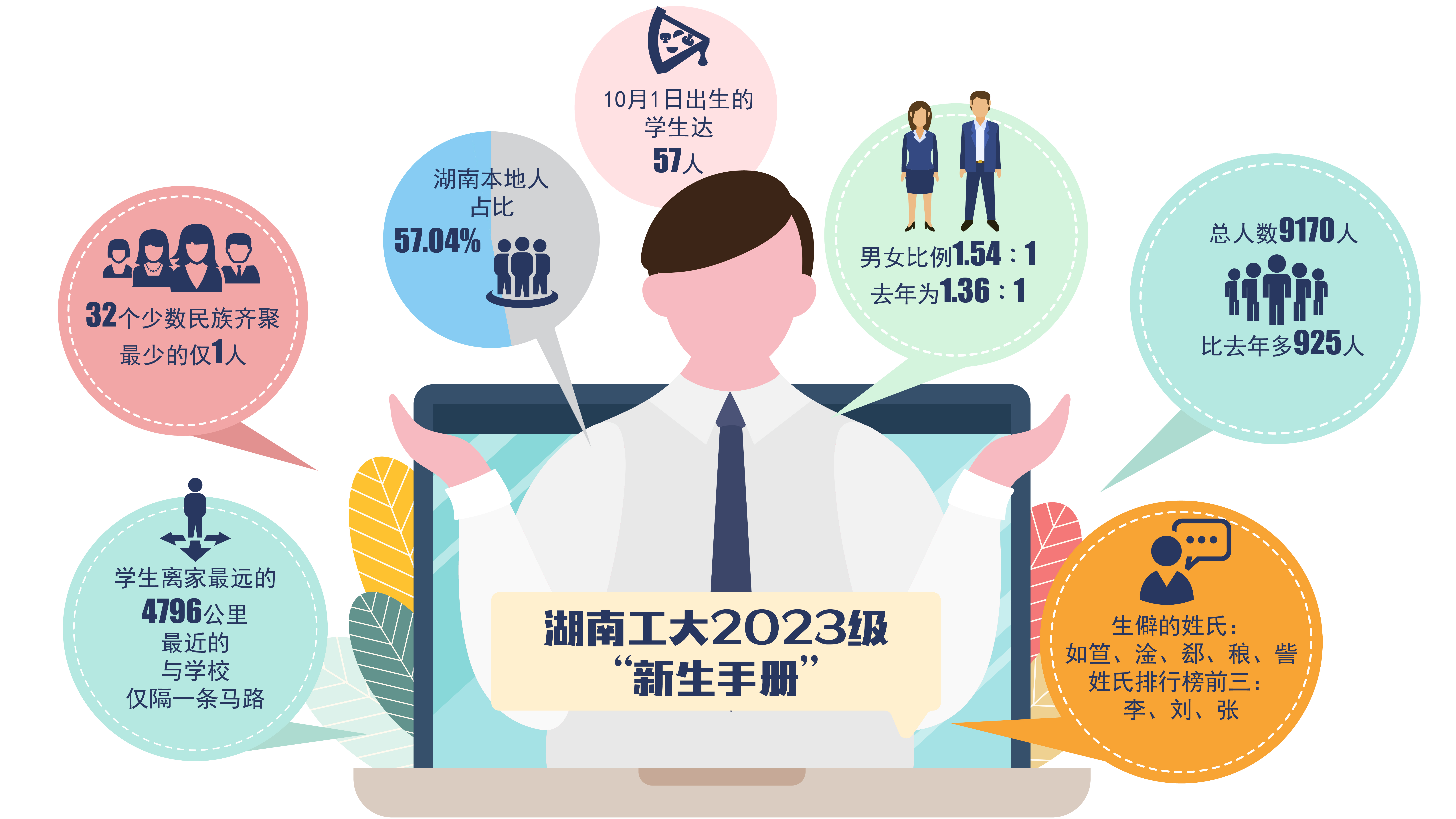 株洲日报讯(全媒体记者/陈驰 通讯员/王少阳) 秋天的风絮唤醒了寂静的校园,今日起,湖南工业大学迎来2023级本科“萌新”入学报到,他们来自哪里、男女比例是多少、姓氏分布如何……昨日,本报记者整理出这份“新生手册”,请仔细阅读,便于大家找到志同道合的朋友,尽快融入校园生活。