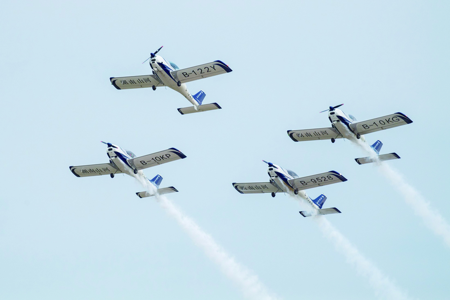 株洲芦淞机场,飞行员进行固定翼编队飞行表演。