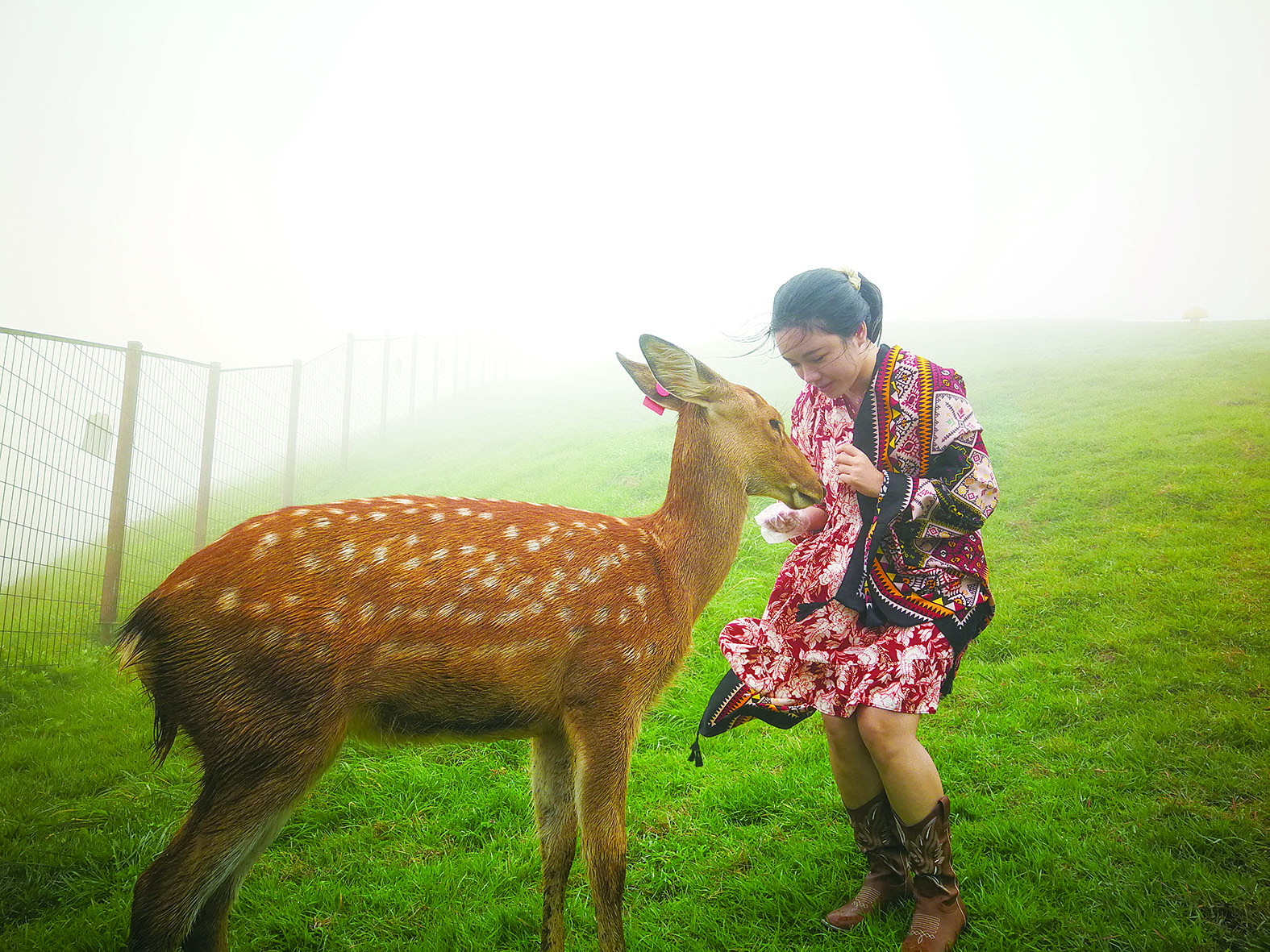 郴州市仰天湖大草原,一只梅花鹿与游客亲密互动,呈现人与自然的和谐景象。 何乐川 摄