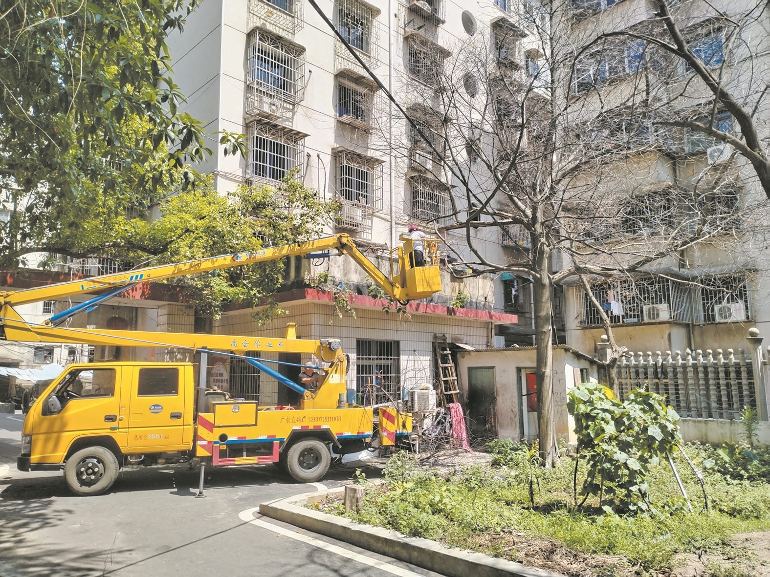 工作人员经过排查发现小区内存在树枝断裂、干枯等情况,不仅影响了小区环境美观和居住采光,也给居民出行带来较大安全隐患。发现隐患后,荷塘区园林绿化中心与社区工作人员对接协调,并通过高空作业车、货车等工具对问题树木和枯枝进行修剪,解决了居民的“烦心事”。