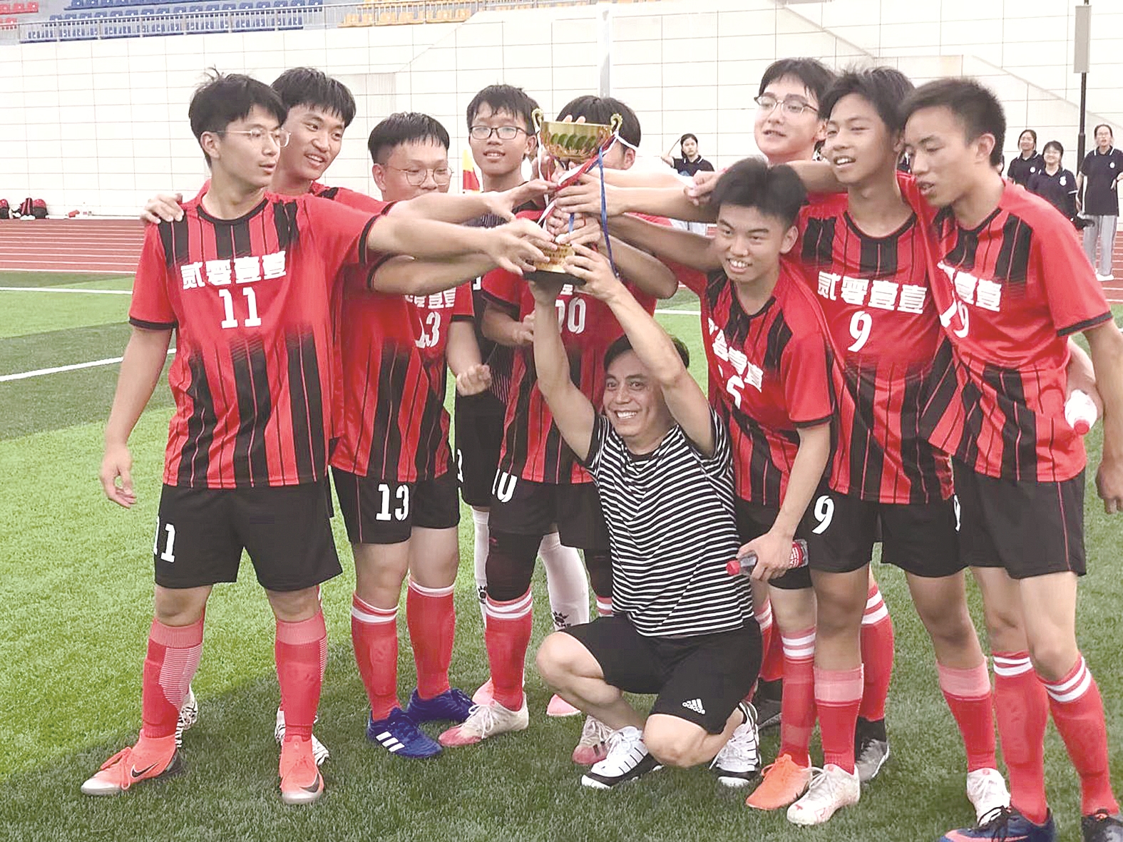 罗军与班级足球队共庆夺冠时刻。 受访者供图