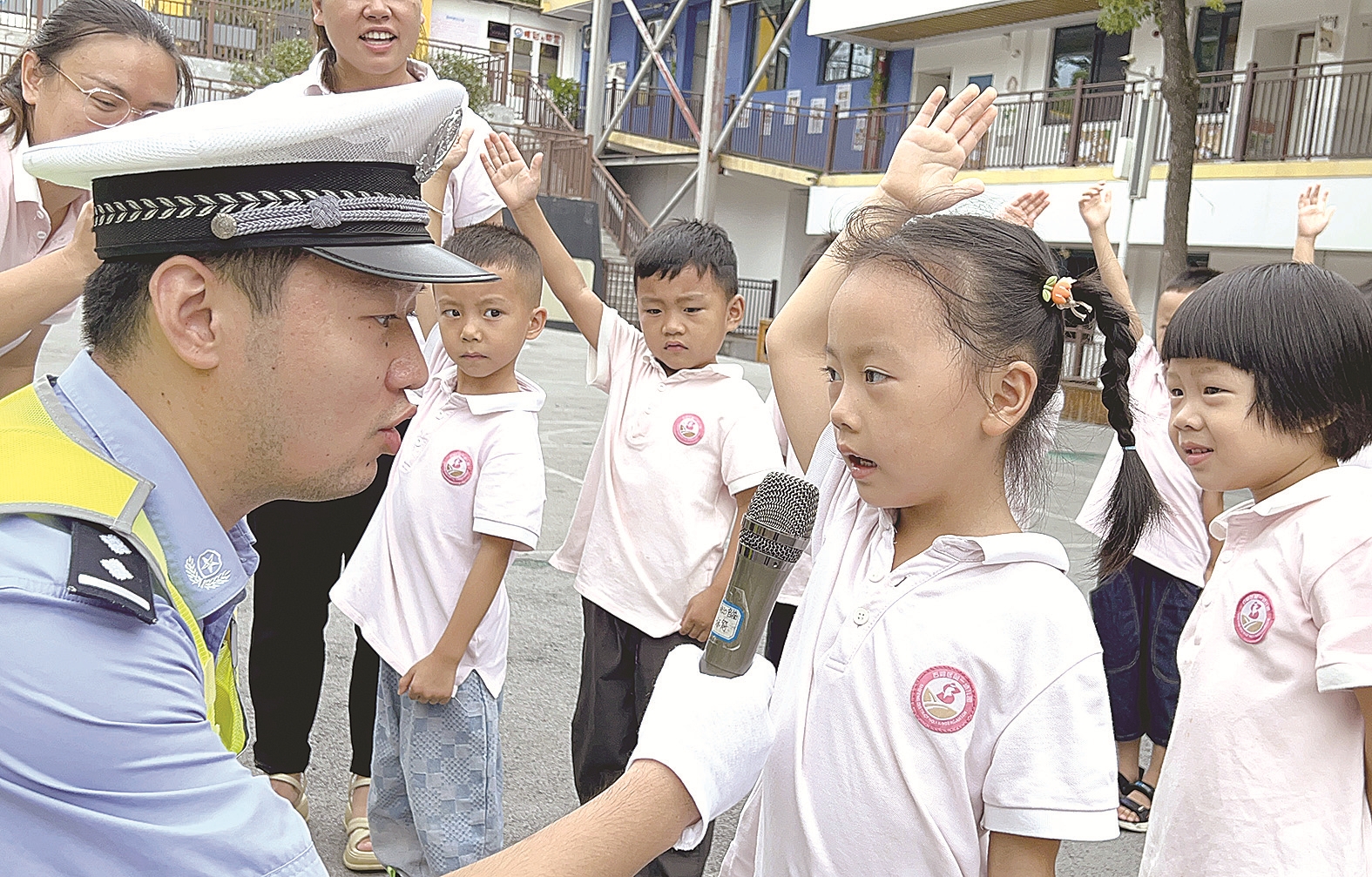 当天,全市交警部门“百警进百校”交通安全第一课活动正式启动,活动将持续到10月底。民警们纷纷走进校园,通过播放影片、发放宣传资料、讲解安全知识等形式,增强师生们交通安全意识和自我防范的能力。孩子们争先恐后参加“交通指挥手势操”、知识问答、游戏互动等活动,心中既长了交安知识,手中又多了交警小熊、反光书包、小熊气球等小礼物,教学相长其乐融融。