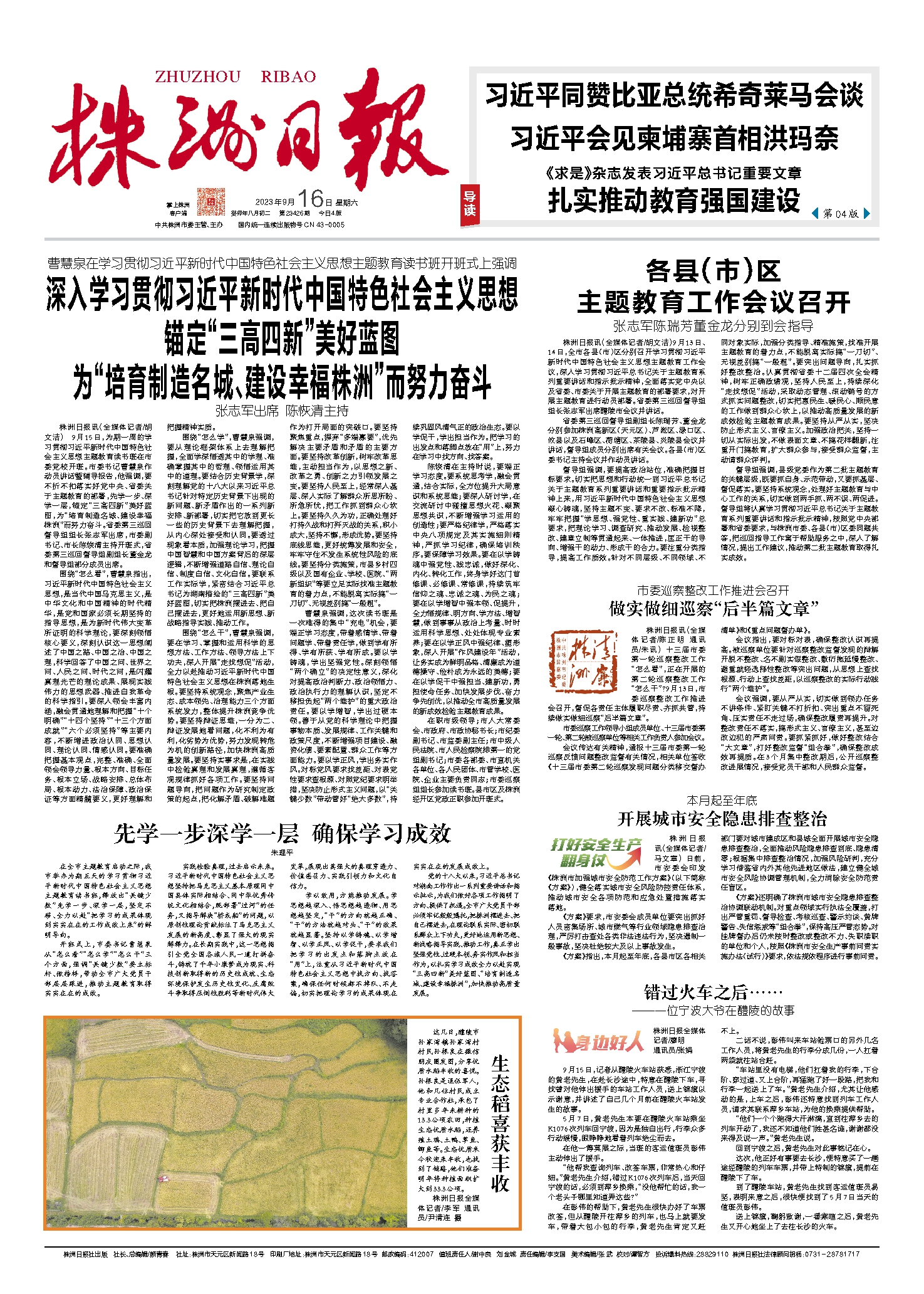 围绕“怎么干”,曹慧泉强调,要在学习、掌握和运用科学的思想方法、工作方法、领导方法上下功夫,深入开展“走找想促”活动,全力以赴推动习近平新时代中国特色社会主义思想在株洲落地生根。要坚持系统观念,聚焦产业生态、成本领先、治理能力三个方面系统发力,整体提升株洲竞争优势。要坚持辩证思维,一分为二、辩证发展地看问题,化不利为有利,化劣势为优势,努力发现转危为机的创新路径,加快株洲高质量发展。要坚持实事求是,在实践中检验真理和发展真理,遵循客观规律抓好各项工作。要坚持问题导向,把问题作为研究制定政策的起点,把化解矛盾、破解难题作为打开局面的突破口。要坚持聚焦重点,摒弃“多端寡要”,优先解决主要矛盾和矛盾的主要方面。要坚持改革创新,树牢改革思维,主动担当作为,以思想之新、改革之勇、创新之力引领发展之变。要坚持人民至上,经常深入基层、深入实际了解群众所思所盼、所急所忧,把工作抓到群众心坎上。要坚持久久为功,正确处理好打持久战和打歼灭战的关系,积小成大,坚持不懈,形成优势。要坚持底线思维,更好统筹发展和安全,牢牢守住不发生系统性风险的底线。要坚持分类施策,市县乡村四级以及国有企业、学校、医院、“两新组织”等要立足实际找准主题教育的着力点,不能脱离实际搞“一刀切”、无视差别搞“一般粗”。