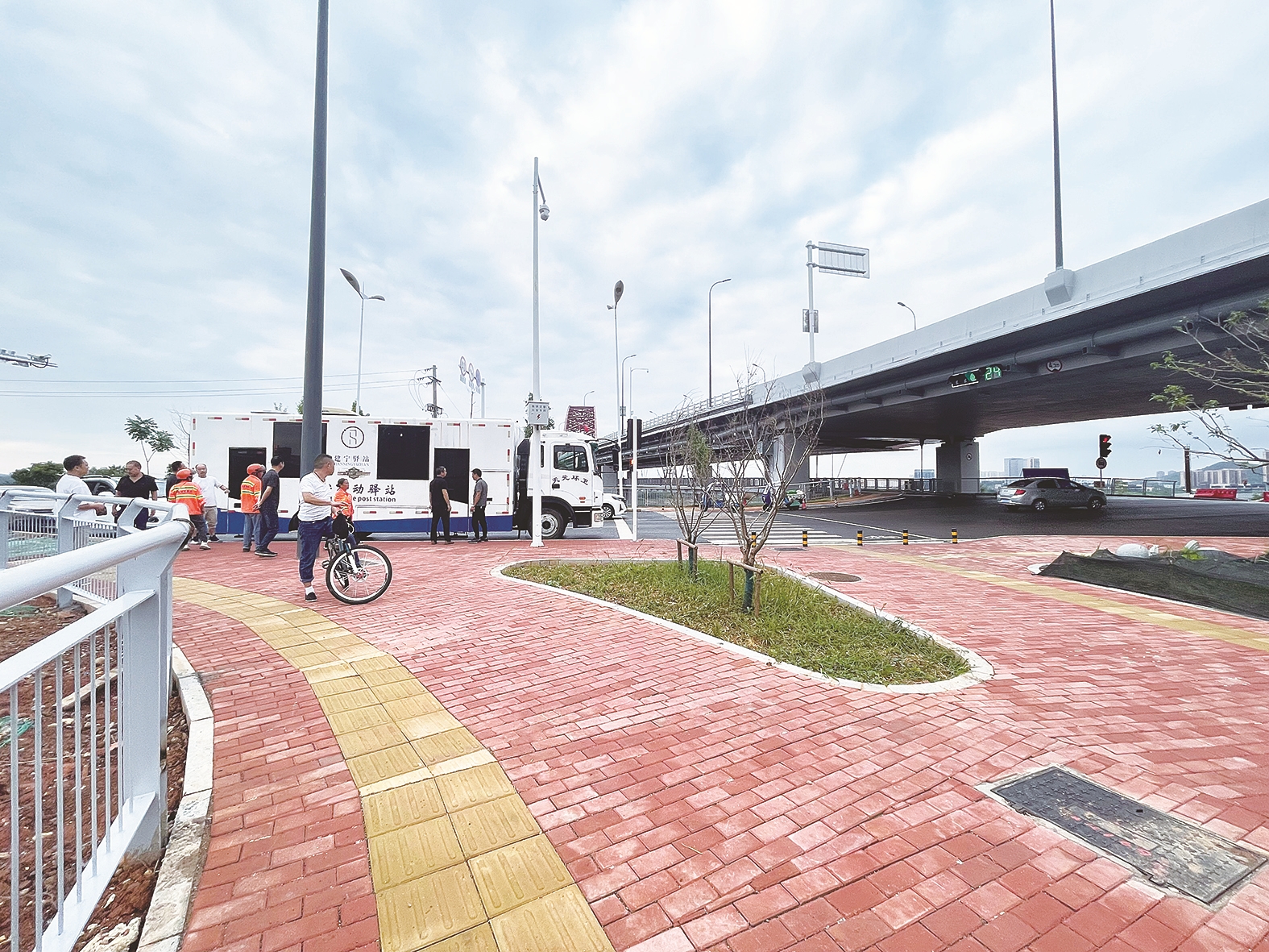 清水塘大桥河西端,配置了临时建宁驿站车。 通讯员 供图