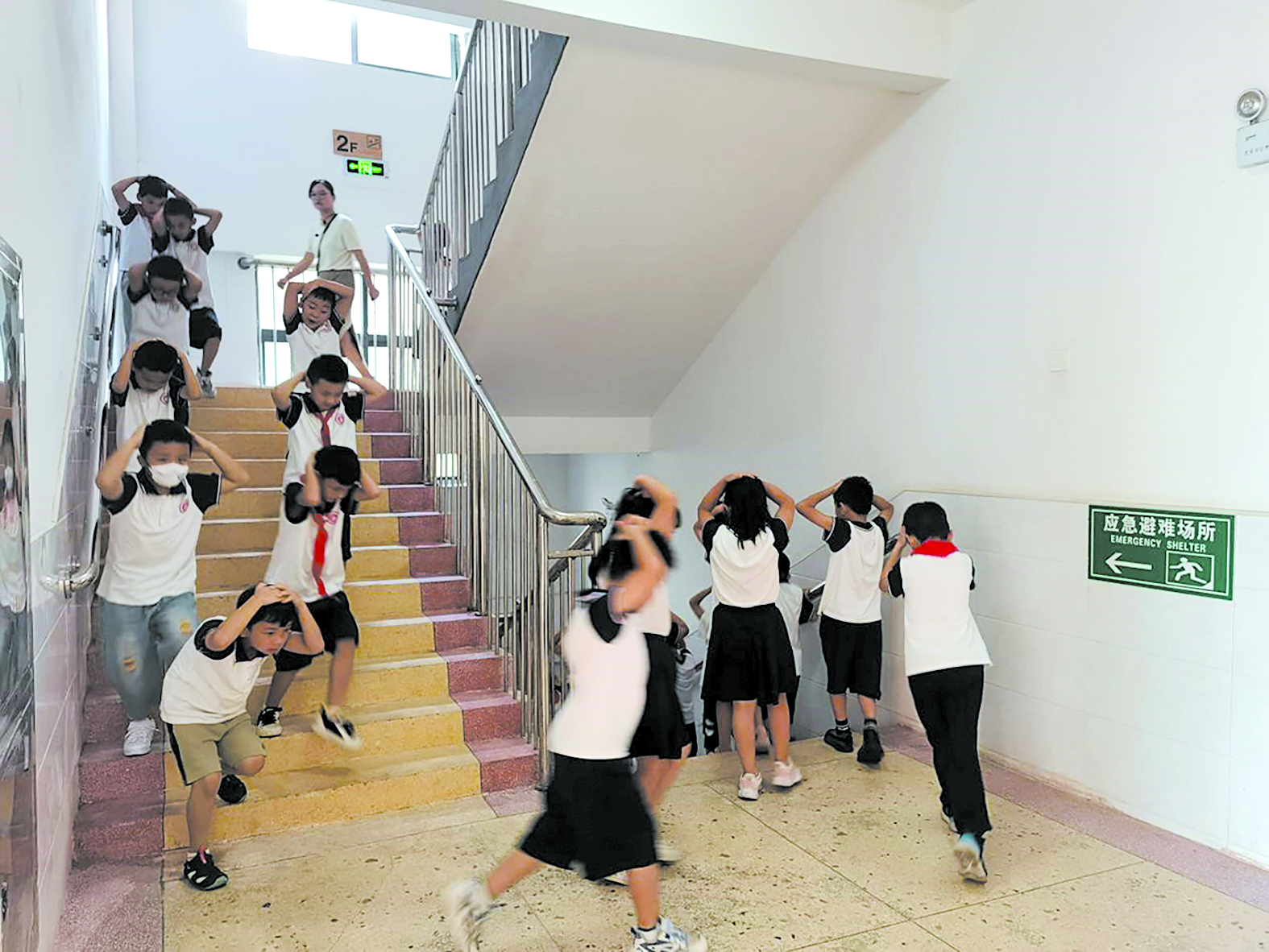 同学们进行应急疏散演练。 记者/戴凛 摄