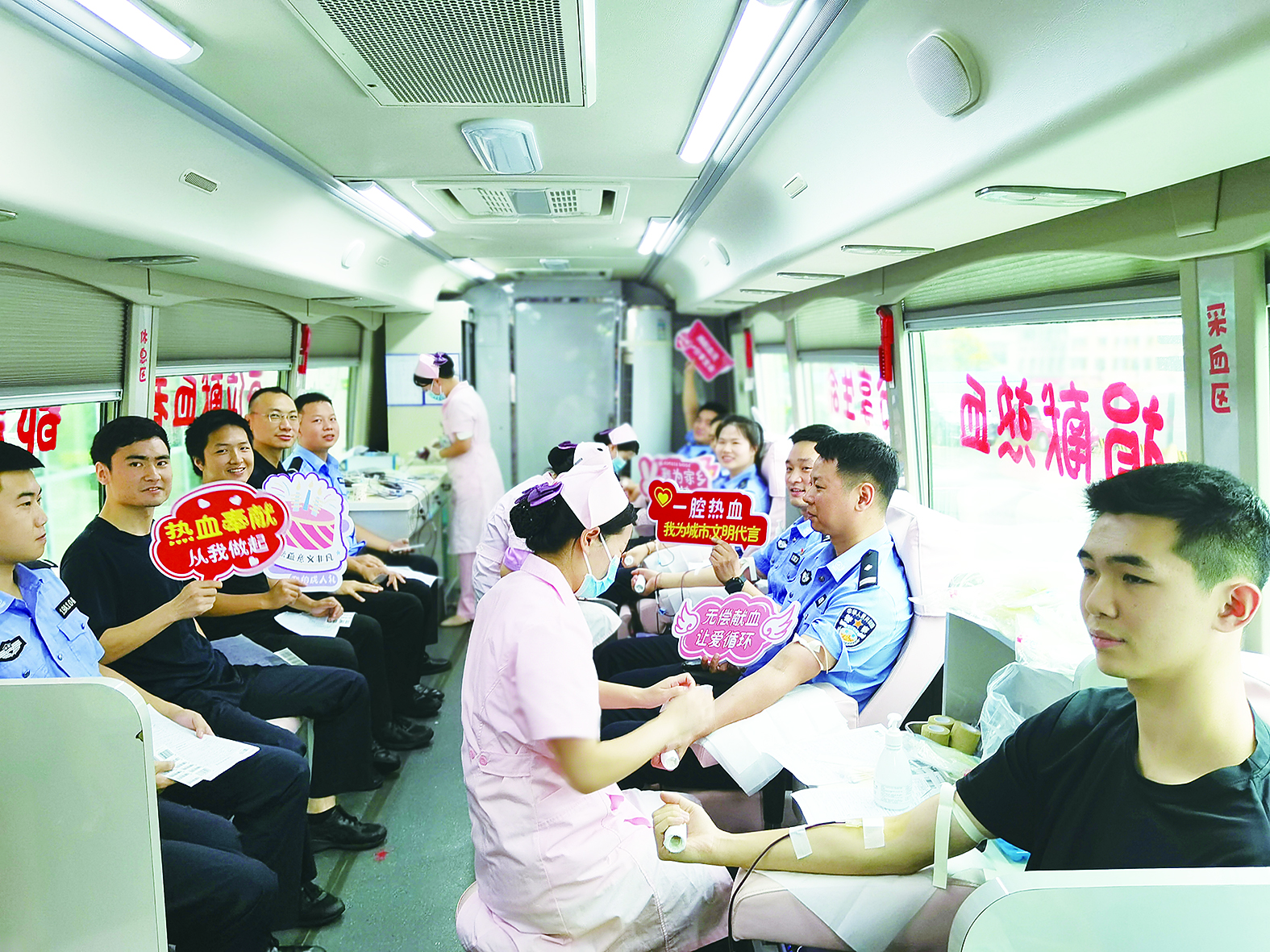 “别紧张,握拳、手展开……”随着护士的引导,鲜红的热血顺着针管缓缓流出,献血车内爱心涌动。