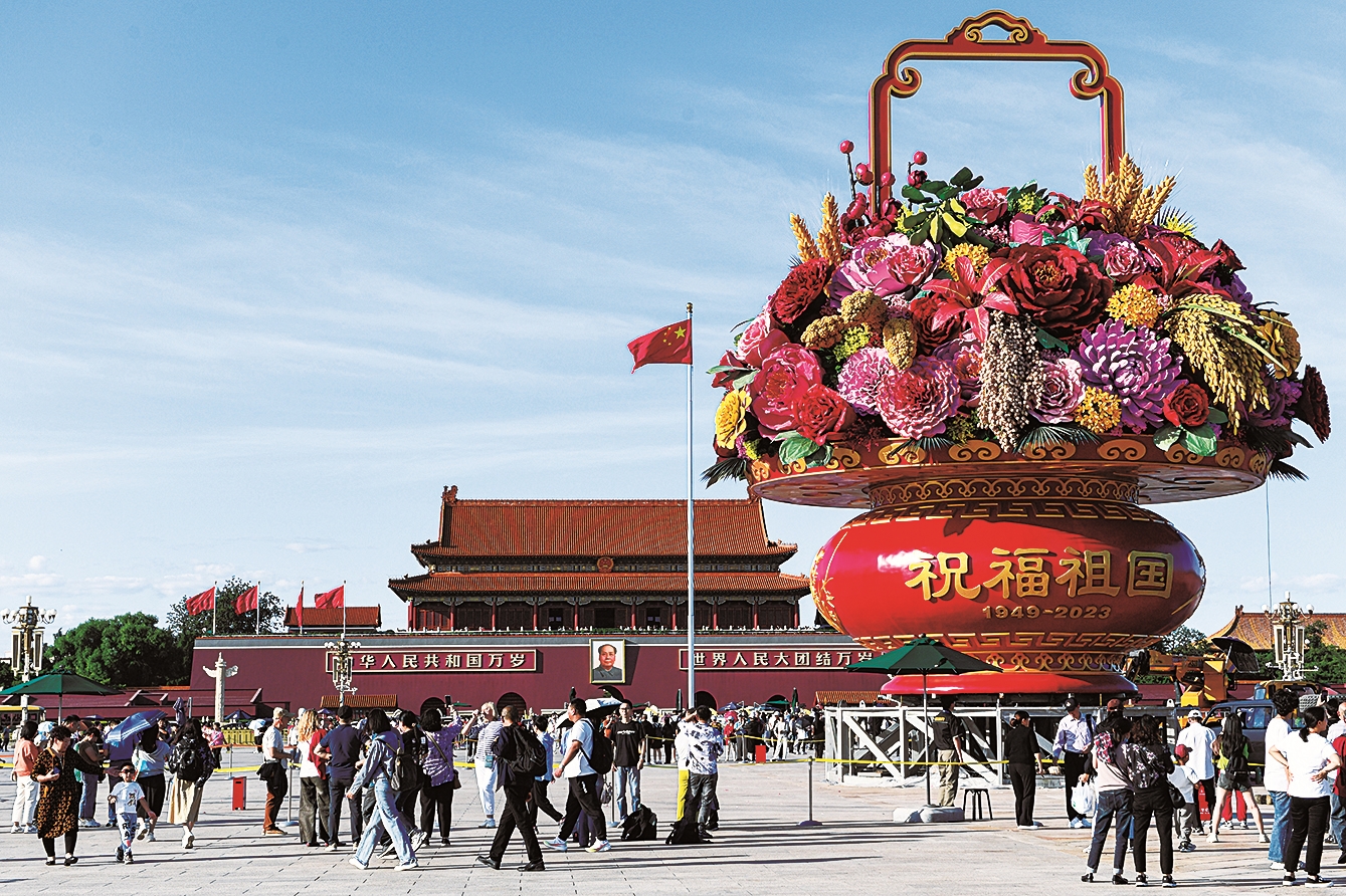 当日,“祝福祖国”巨型花篮主体亮相北京天安门广场,花篮顶高18米,篮内首次选取了喜庆丰收的五谷(水稻、小麦、小米、黄米、大豆),结合具有美好寓意的花卉,体现花团锦簇、五谷丰登;篮体南侧书写“祝福祖国,1949-2023”字样,篮体北侧书写“欢度国庆,1949-2023”字样。