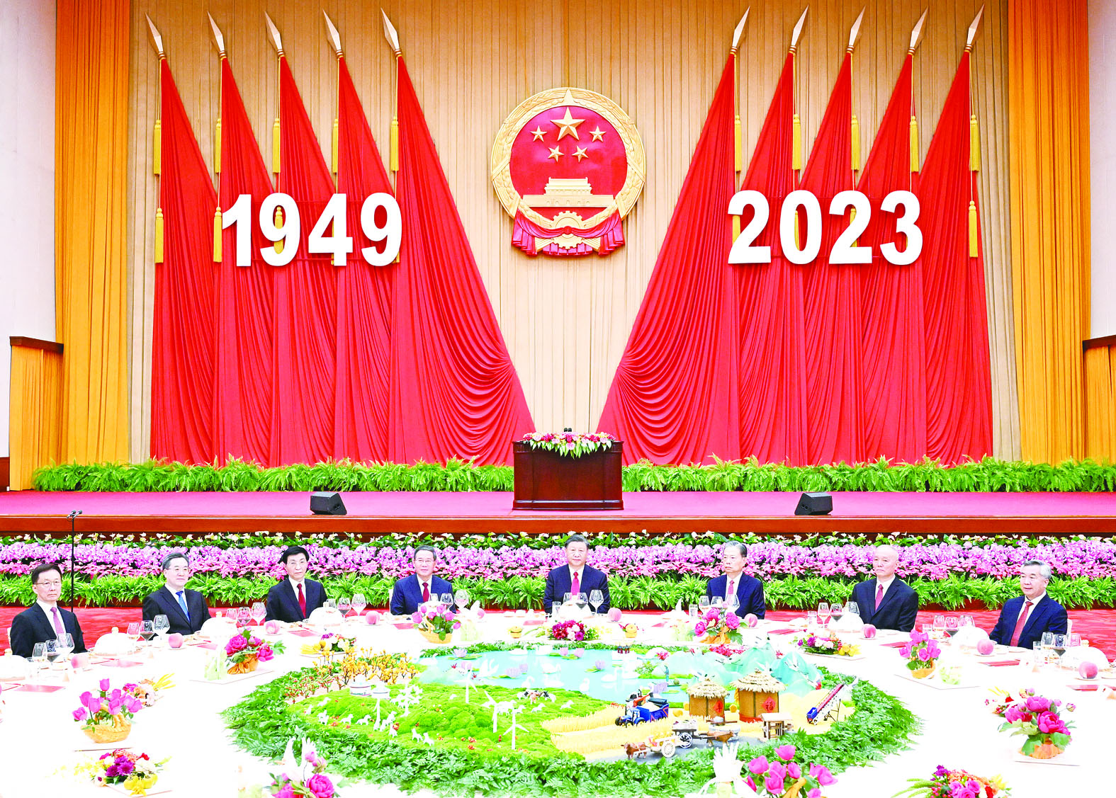人民大会堂宴会厅华灯璀璨、鲜花绽放,洋溢着喜庆热烈的节日氛围。主席台上方高悬着庄严的国徽,“1949-2023”大字年号在鲜艳的红旗映衬下格外醒目。