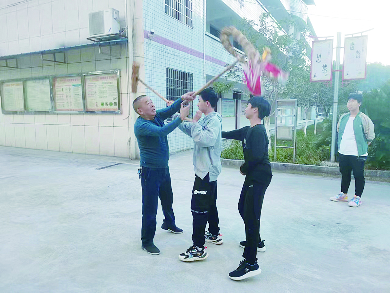 何三余(左)现场指导学生演练客家火龙。 受访者 供图