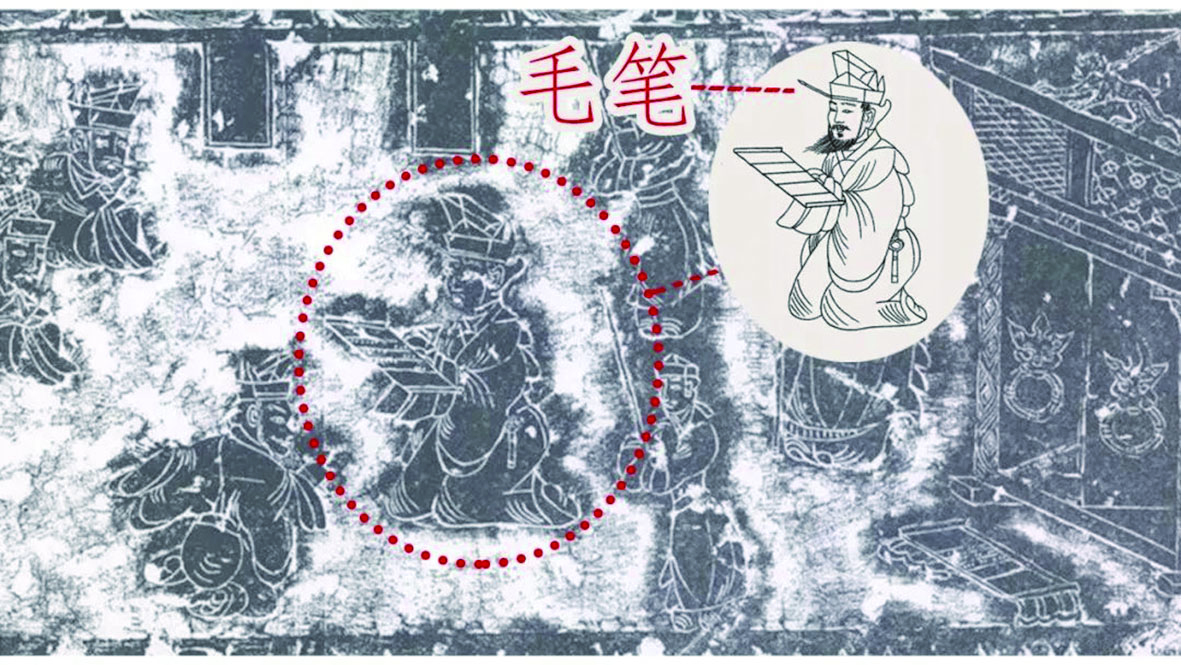 目前最早的关于簪笔的记载,出现在《史记·滑稽列传》中,“西门豹簪笔磬折,向河立待良久”说的就是它。除了文字记载还有“照片”为证,山东沂南汉墓出土的画像石上,一位官吏双膝下跪双手捧举案牍,耳旁便插着一支毛笔。后来,簪发的毛笔从“洗干净也能用”变成“没蘸过墨的白笔”,这种时尚也就正式变成一种“身份符号”,被称为“簪白笔”。