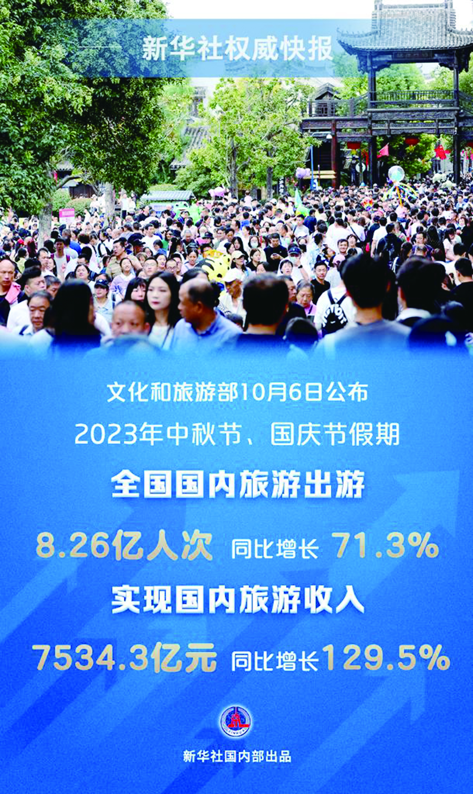 经文化和旅游部数据中心测算,2023年中秋节、国庆节假期,全国国内旅游出游人数8.26亿人次,同比增长71.3%,按可比口径较2019年增长4.1%;实现国内旅游收入7534.3亿元,同比增长129.5%,按可比口径较2019年增长1.5%。