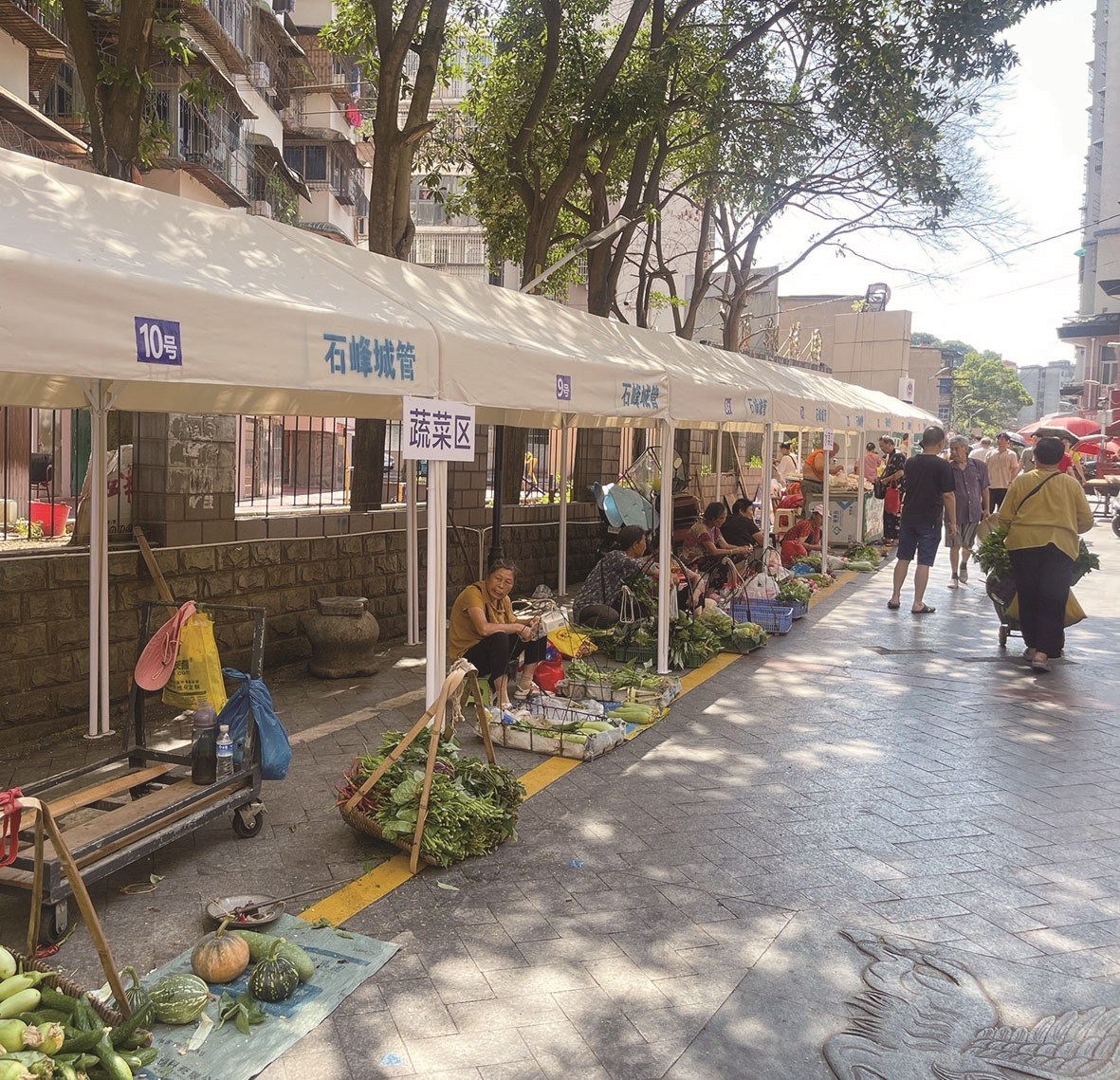 针对临街商户门店狭小等问题,设置“一米线”,为商家合规外摆提供规范;设置定时定点的疏导区,允许本地菜农有序摆摊,解决随意占道乱象;设立遮阳挡雨篷,引导沿街商户分类入驻经营,并签订“文明公约”……
