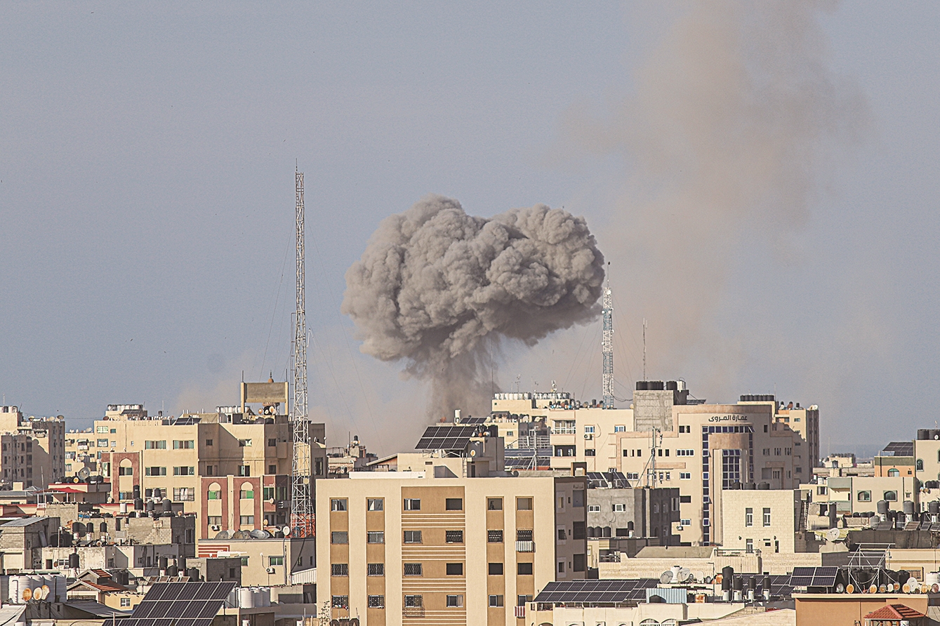 10月7日在加沙城拍摄的以色列军队空袭地面建筑造成的浓烟。 新华社发(里泽克·阿卜杜勒贾瓦德 摄)