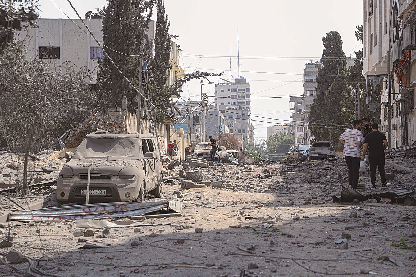 10月8日,巴勒斯坦人在加沙城查看以色列空袭后的街道。 新华社发(里泽克·阿卜杜勒贾瓦德 摄)