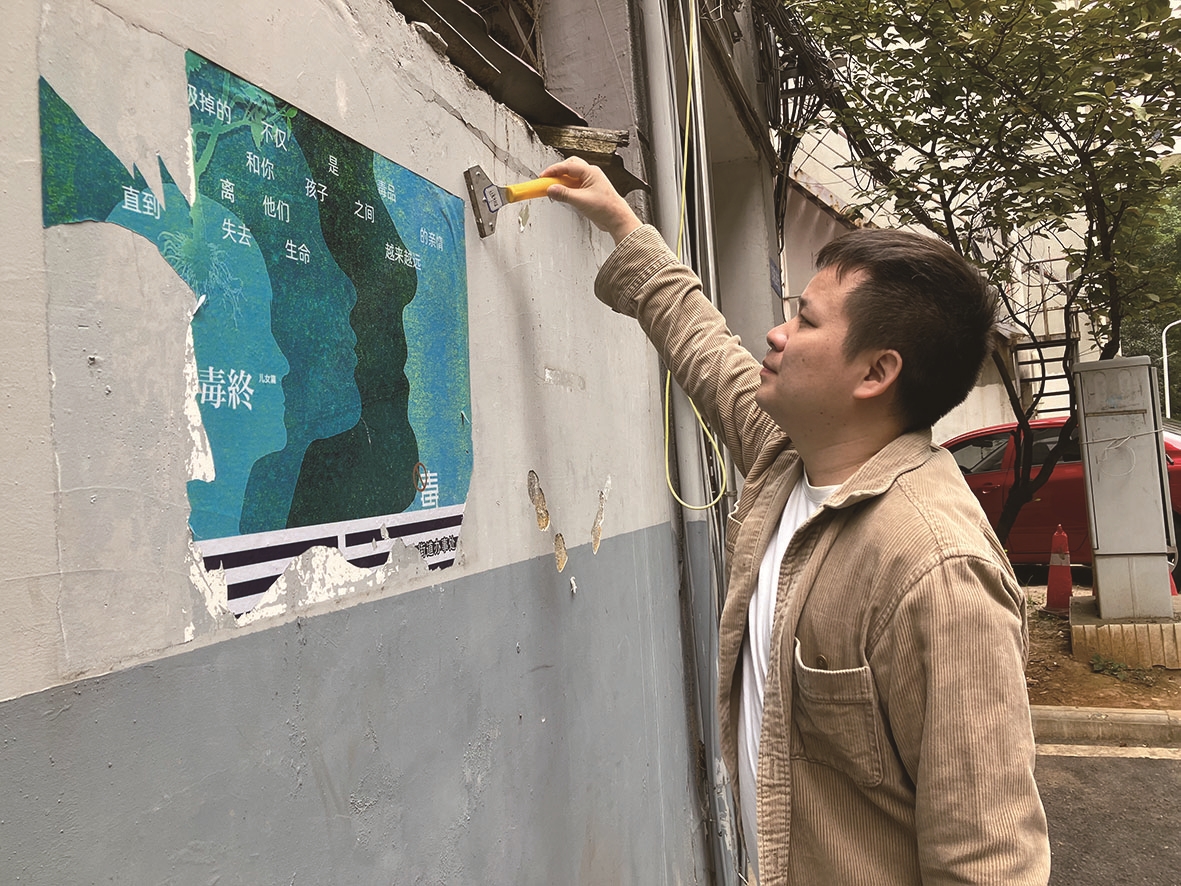 10月12日上午,株洲日报社党员志愿者廖喜张正在铲除墙上破损的广告。 记者/姚时美 摄