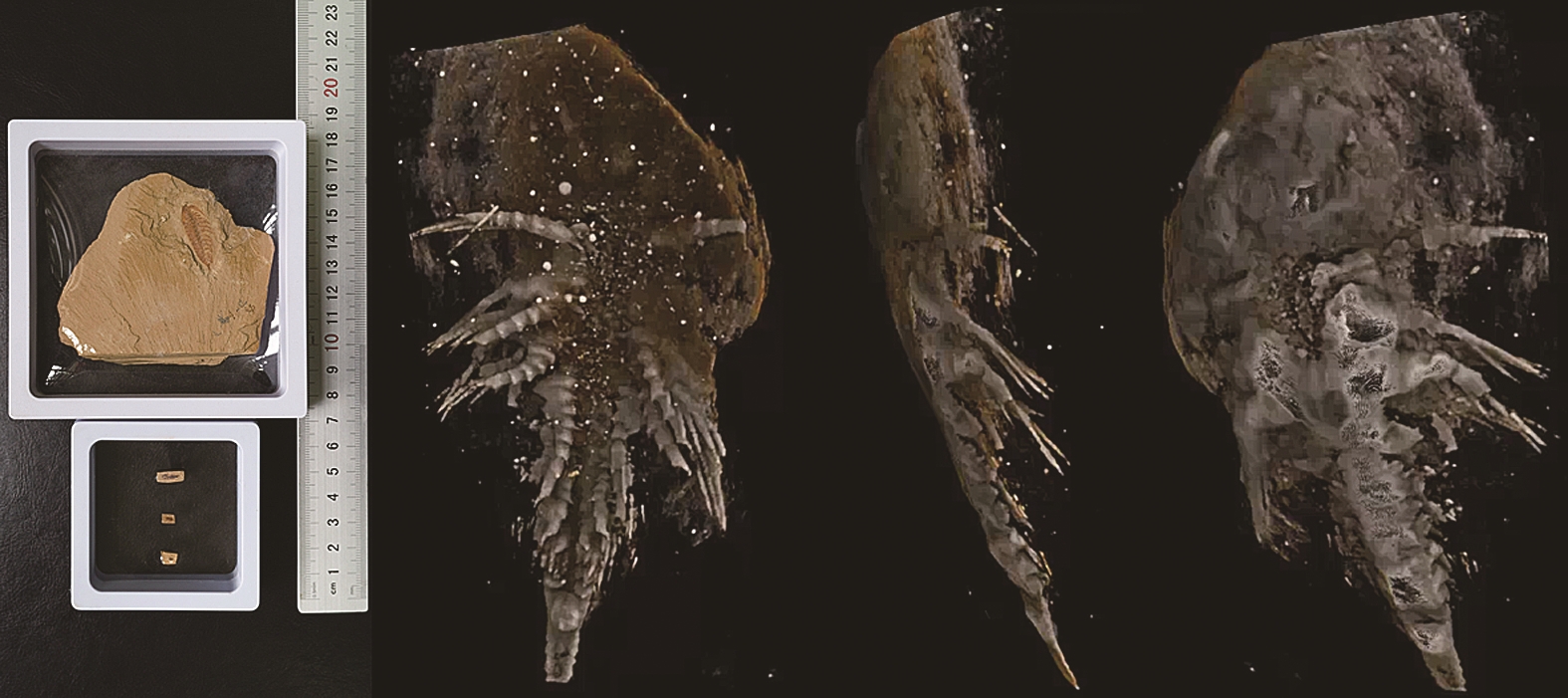 这是一张拼版照片,左边为不同生长时期的迷人林乔利虫化石,右边为云南大学古生物研究院研究员刘煜团队拍摄的迷人林乔利虫不同方位的CT片(10月11日摄)。