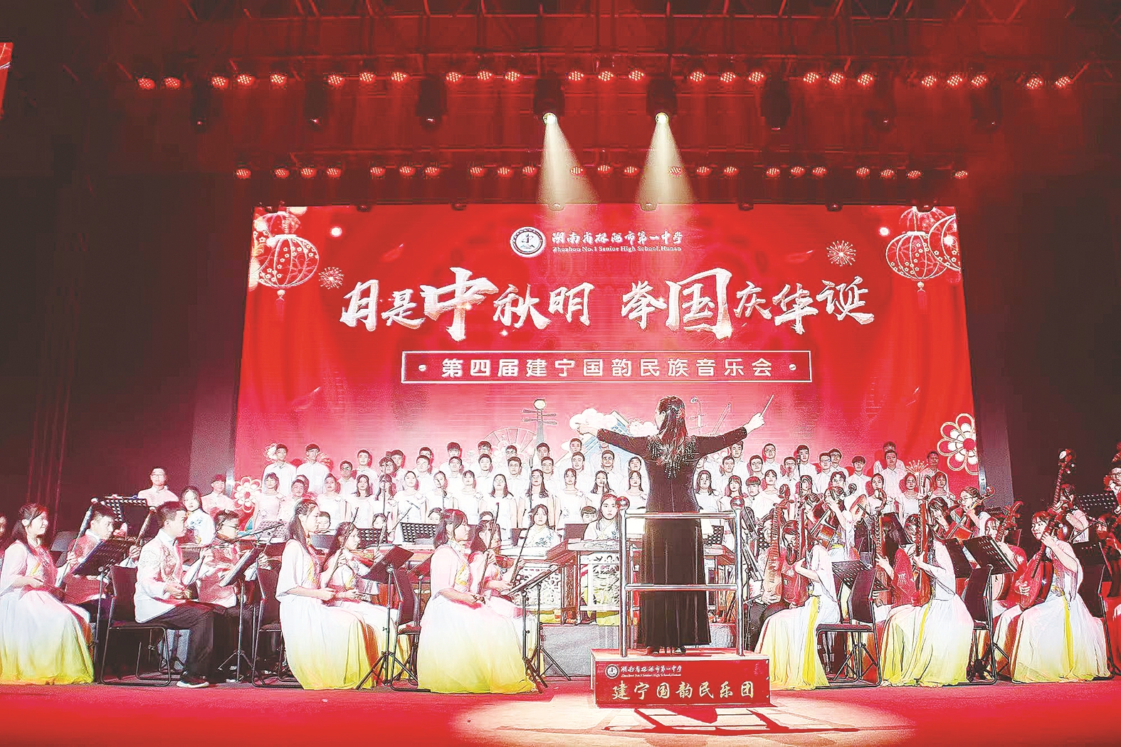 该校“建宁国韵”民乐团,声名赫赫。自2015年建团以来,乐团通过开放胸怀引进资源,常规训练保证基础,交流研讨提升能力,演出竞赛扩大影响,专场音乐会升级品质等方式,培养了一批又一批民乐演奏人才,成为闪亮的名片。如今,已有团员90余人,拥有专业大型合排室两间,分排室7间,独立琴房十余间,民乐团特聘省、市专家数人常驻指导,形成了独立且完善的课程管理体系。乐团自建立以来,已赴新加坡、上海、广州、深圳、郑州等地学习、参赛和交流,曾荣获第七届亚洲国际艺术大赛一等奖、优秀教育单位,湖南省中小学生艺术展演一等奖等荣誉,举办了五届“建宁国韵”专场民族音乐会。