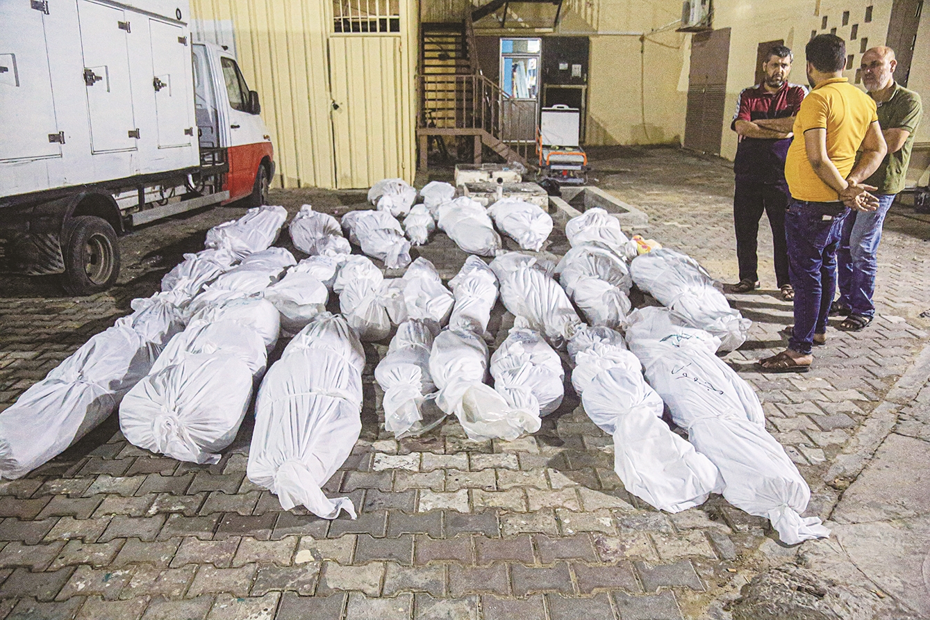10月15日,在加沙地带中部的代尔拜莱赫,人们站在死去的亲属旁。 新华社发(里泽克·阿卜杜勒贾瓦德 摄)