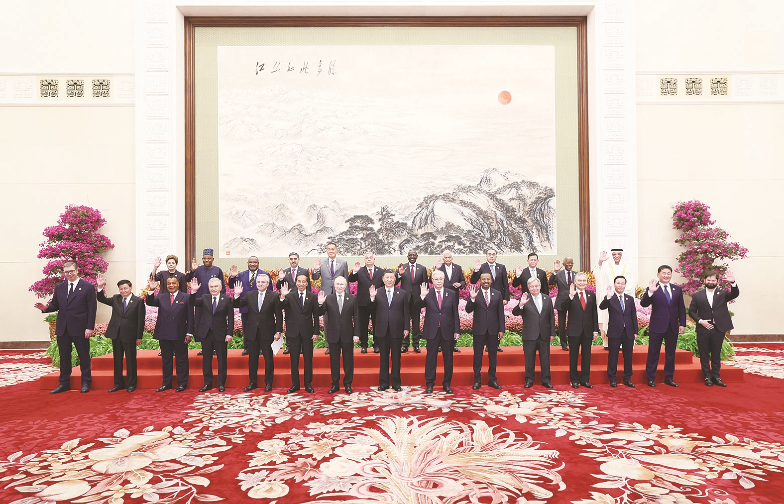 阿根廷总统费尔南德斯,智利总统博里奇,刚果共和国总统萨苏,印度尼西亚总统佐科,哈萨克斯坦总统托卡耶夫,肯尼亚总统鲁托,老挝国家主席通伦,蒙古国总统呼日勒苏赫,俄罗斯总统普京,塞尔维亚总统武契奇,斯里兰卡总统维克拉马辛哈,土库曼斯坦民族领袖、人民委员会主席别尔德穆哈梅多夫,乌兹别克斯坦总统米尔济约耶夫,越南国家主席武文赏,柬埔寨首相洪玛奈,埃及总理马德布利,埃塞俄比亚总理阿比,匈牙利总理欧尔班,莫桑比克总理马莱阿内,巴基斯坦总理卡卡尔,巴布亚新几内亚总理马拉佩,泰国总理赛塔,尼日利亚副总统谢蒂马,阿联酋总统特别代表、哈伊马角酋长国酋长卡西米,法国总统特别代表、前总理拉法兰,希腊总理高级代表、发展部部长斯克雷卡斯等20多国国家元首、政府首脑、高级代表,以及联合国秘书长古特雷斯、新开发银行行长罗塞夫等国际组织负责人出席开幕式。