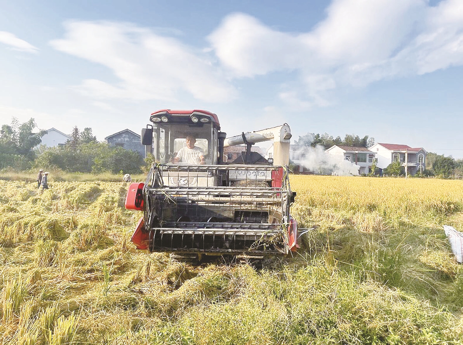 装有北斗系统的收割机,正在田间作业。 记者/杨如 摄