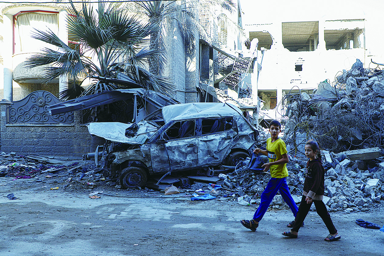 10月20日,在加沙地带南部城市汗尤尼斯,儿童走过遭以色列袭击损毁的建筑。 新华社发(里泽克·阿卜杜勒贾瓦德 摄)