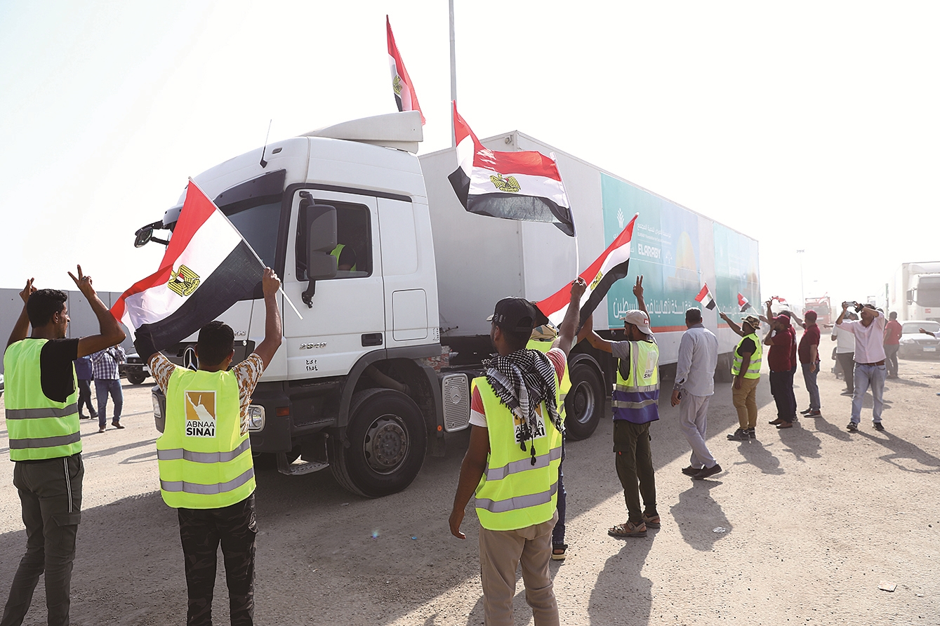 10月22日,在拉法口岸埃及一侧,载有人道救援物资的货车准备通过拉法口岸前往加沙地带。 新华社发(艾哈迈德·戈马 摄)