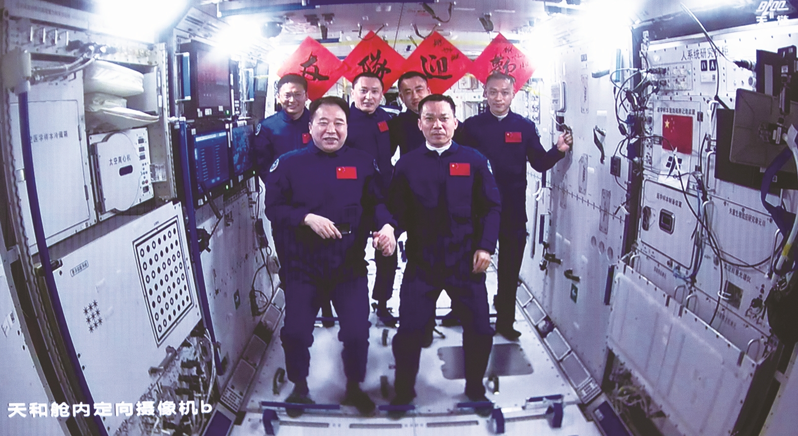 这是10月26日在北京航天飞行控制中心拍摄的神舟十七号航天员乘组和神舟十六号航天员乘组“全家福”。