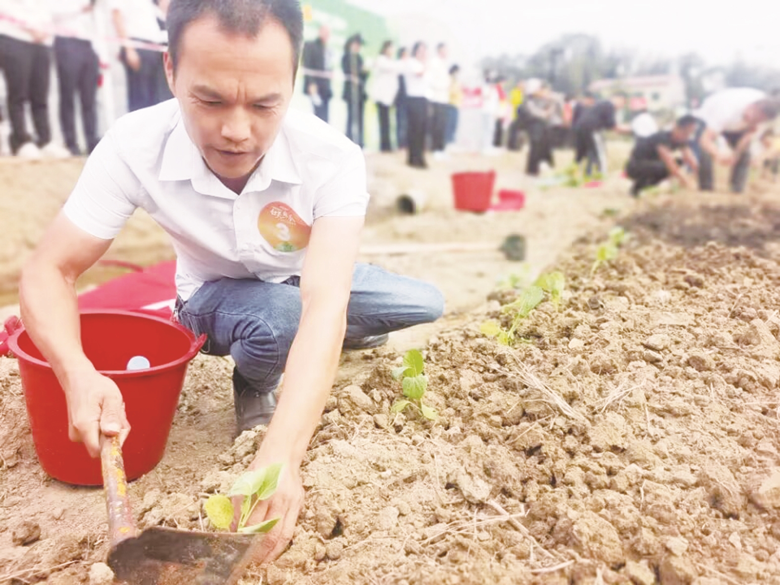 随着裁判一声令下,白关镇东庄村的晏雄立即挥舞着一把锄头开始整地,只见他手腕使劲一弯曲,锄头瞬间嵌入泥土里;再轻轻往上一撬,一排排大小一致的小坑就出现在了眼前。紧接着,他将一株株蔬菜苗植入坑中,双手插入泥土用力一掐,蔬菜苗的根部瞬间裹满了泥土,稳稳当当地立在田地里;扶正、填土、浇水……一整套动作行云流水。