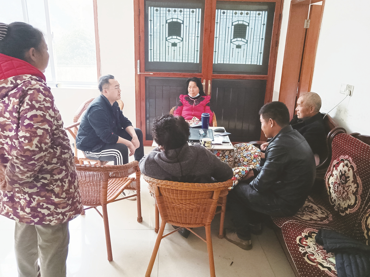 柳萧(左一)在村民家中调解邻里纠纷。受访者供图