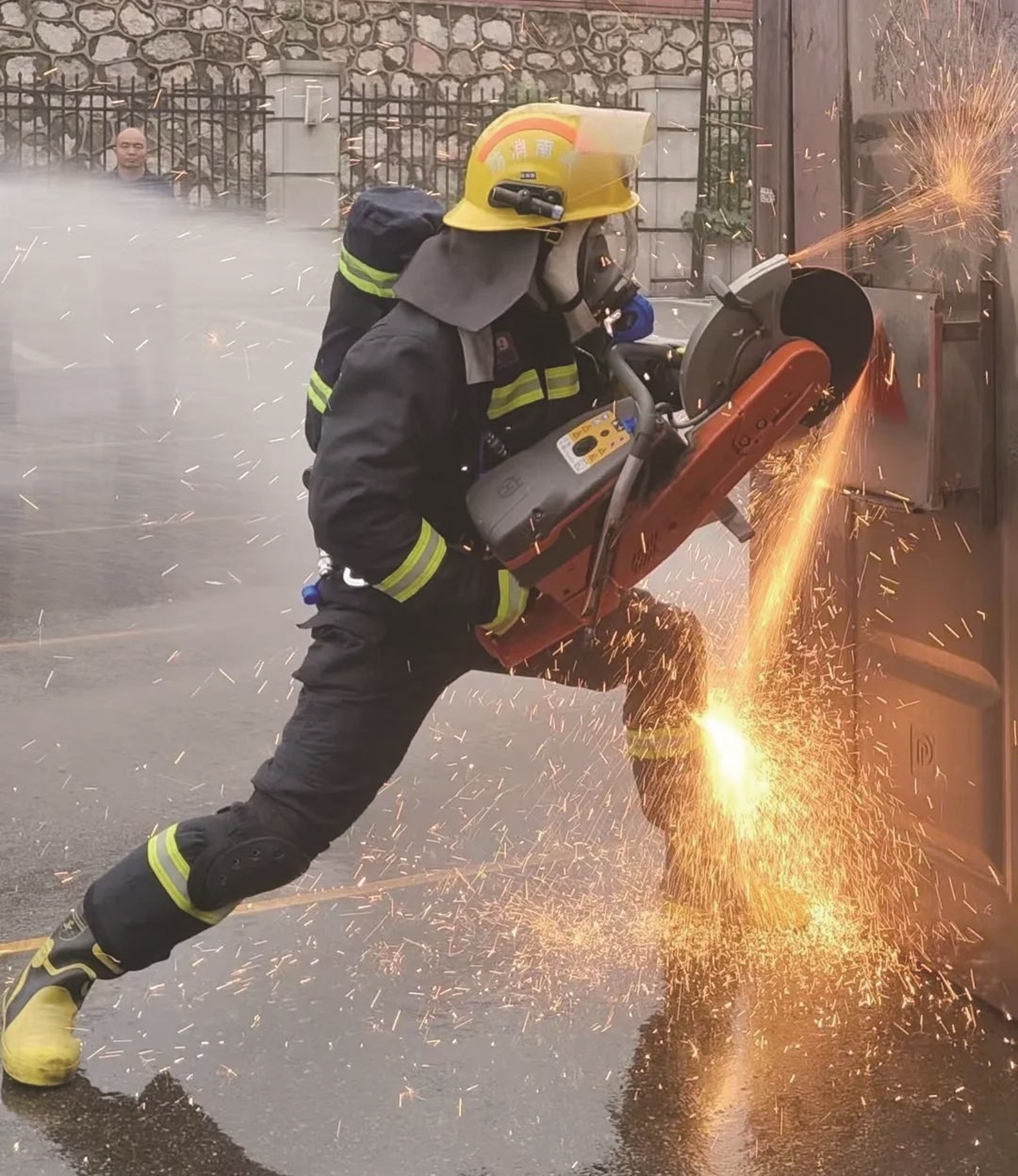快速破拆入室灭火(见图)、在灯泡上完成3毫米钢棍精准切割、攀登15米高墙一气呵成……近日,市消防、应急、人社等部门联合举办全市第二届消防行业职业技能竞赛,全市10支代表队同场展开技战术切磋。