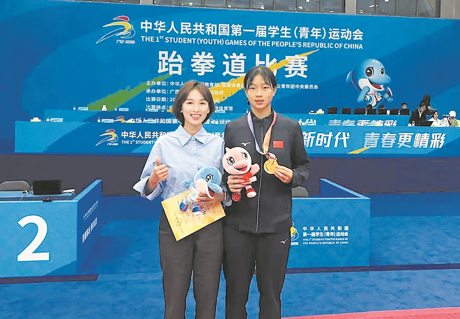 由教育部、体育总局、共青团中央联合的全国第一届学生(青年)运动会,日前在南宁市展开为期4天的跆拳道比赛。17岁的醴陵妹子李炜(右)一路过关斩将,获得女子57公斤级冠军。