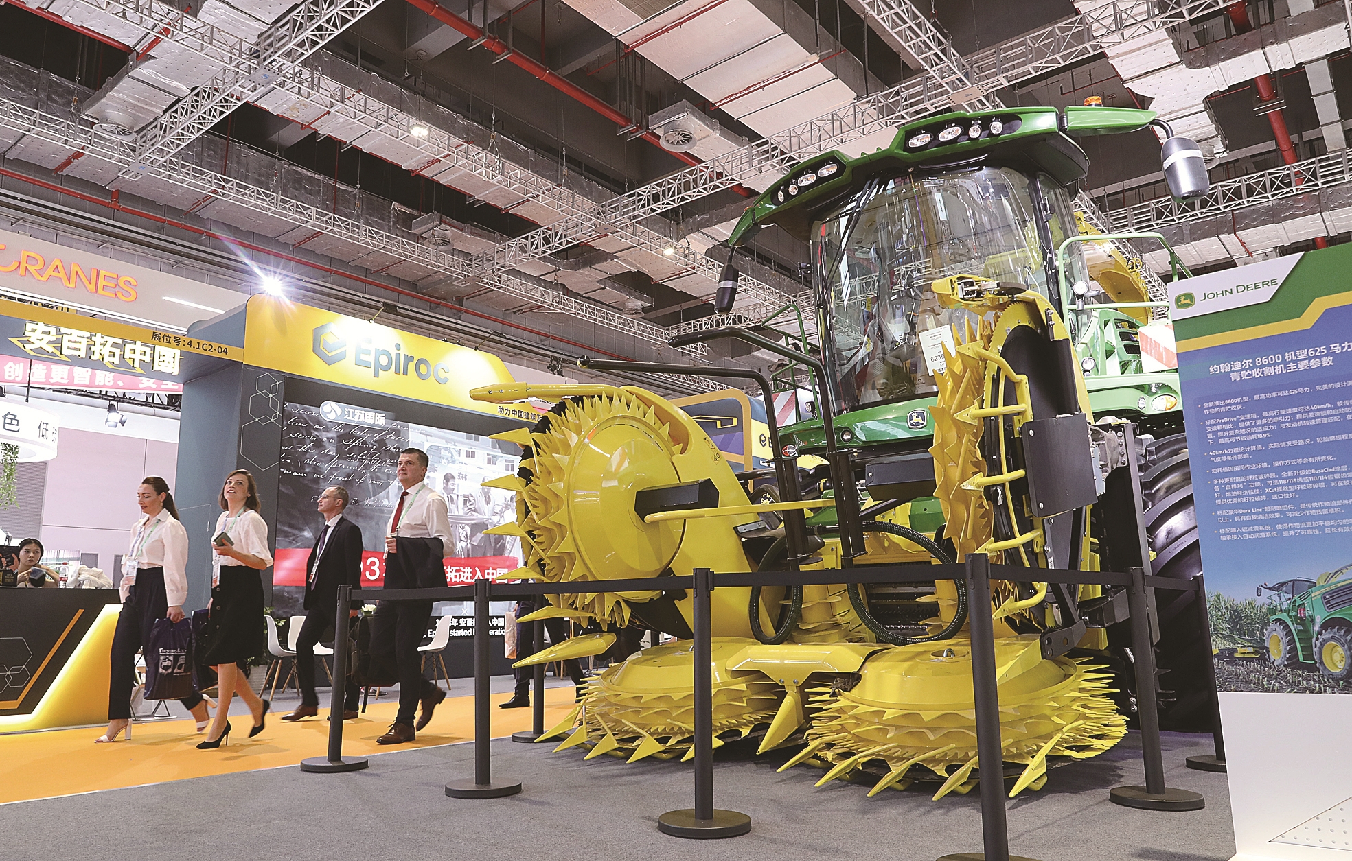 当日,参观者在第六届进博会上经过约翰迪尔公司推出的8600机型青贮收割机展品。