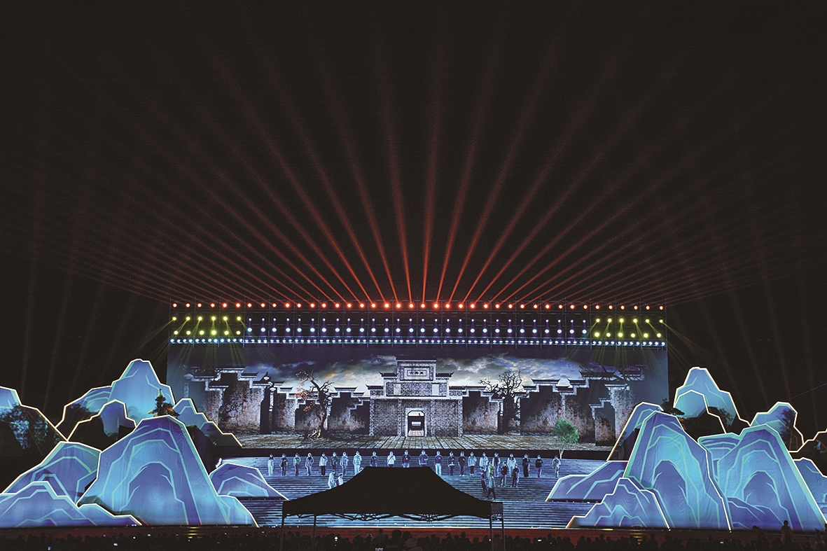 株洲第二届旅发大会开幕式晚会舞台设在炎陵县文化体育中心前坪,舞台呈“1+3+2”结构,即一个主舞台、三级平台加两个副舞台,舞台呈立体阶梯式,配上敞开式的舞美,舞美还做了青山诗经造型,舞台前区设有环绕人造水系。从舞台前方看,一幅炎陵山水画卷就在眼前,令人震撼。