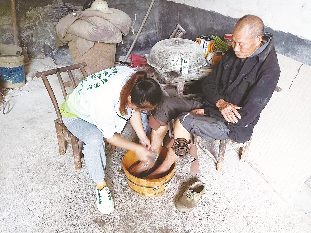 社工唐洁为患有类风湿性关节炎的困境老人郭铁光洗脚、艾灸。 三门镇社工站 供图