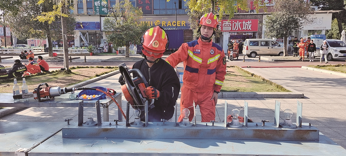 在消防指战员的指导下,湖南化工职业技术学院学生李潇迅速掌握了要领,用无齿锯切割机,成功将灯泡上方的铁丝剪断,而灯泡完好无损。“第一次近距离体验消防安全,完美演练,很有成就感。”李潇兴奋地说。