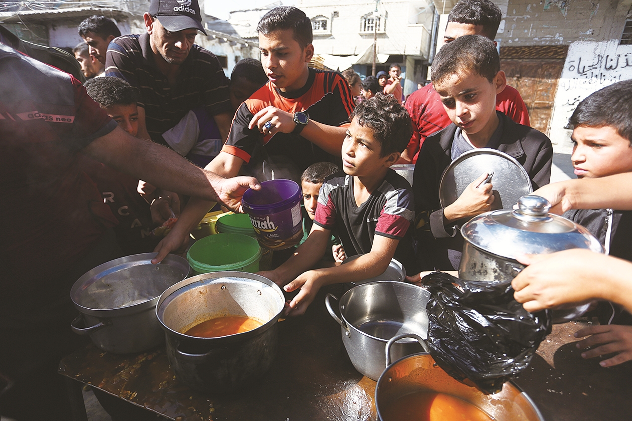11月9日,在加沙地带南部城市拉法,人们在一个临时分发点排队领取食物。 新华社发(哈立德·奥马尔 摄)
