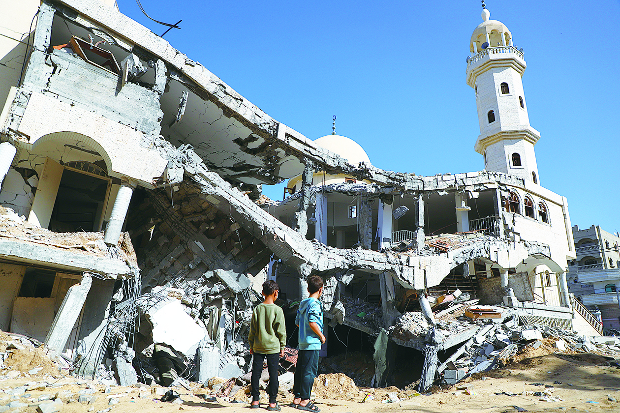 11月9日,孩子们站在加沙地带南部城市汗尤尼斯被损毁的建筑前。 新华社发(里泽克·阿卜杜勒贾瓦德 摄)