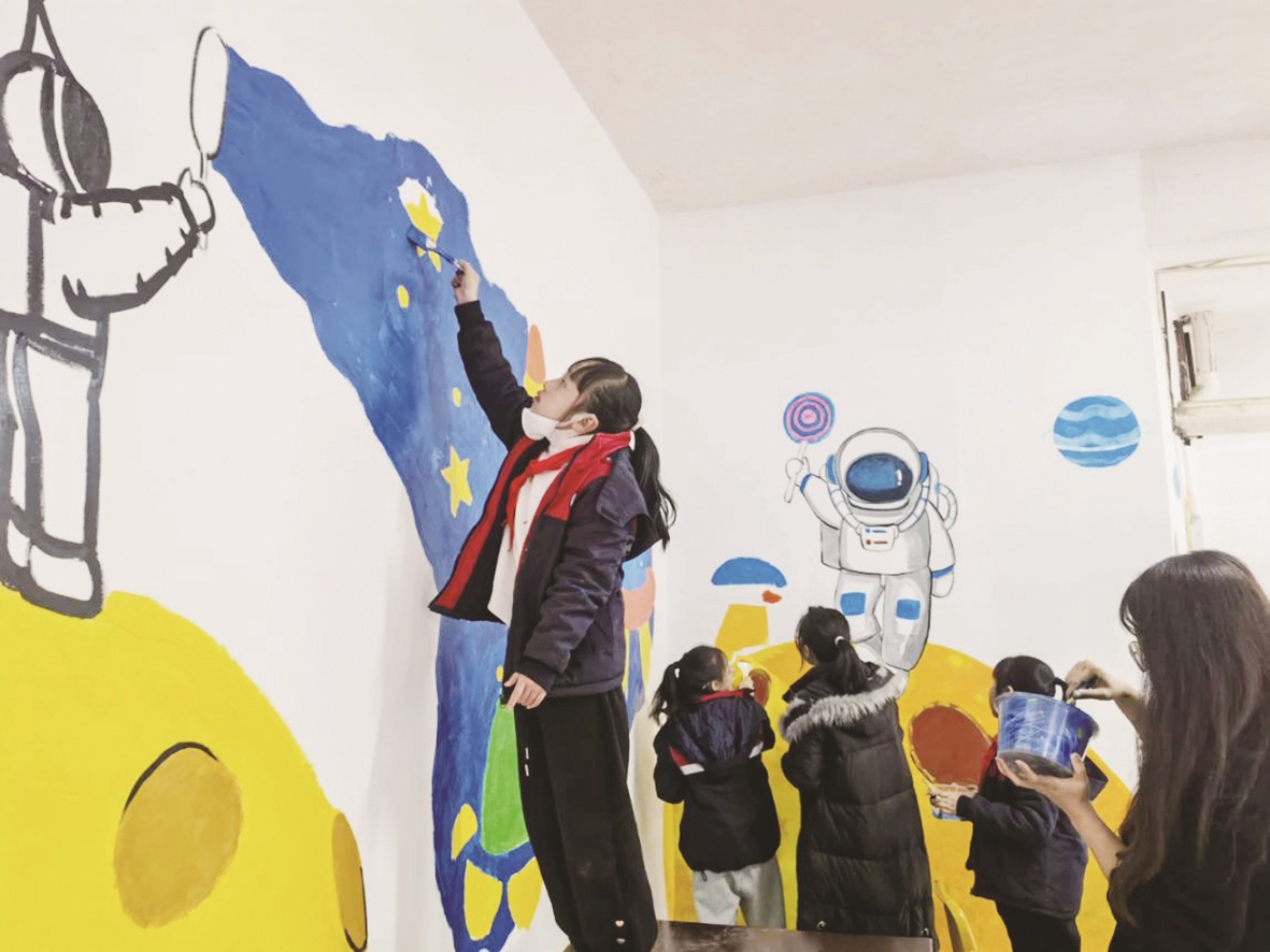 本次墙绘围绕“航天梦”主题,描绘出人类探索浩瀚宇宙,发展航天事业的梦想与情感。活动中,学生们在美术老师的指导下,一勾一点、一笔一画,绘画出美丽的星空、飞速的火箭、登上月球的宇航员等。老师介绍,希望通过这样的活动,丰富学生的审美体验,以美育人,厚植学生爱国主义情怀。