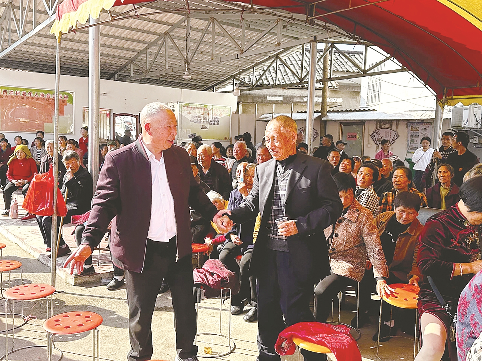 重阳节活动中,陈再相(左)热情招呼村里老人。罗霁宣 摄