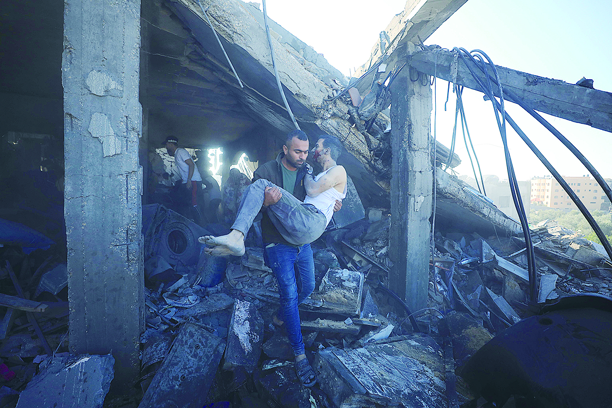 11月17日,在加沙地带南部城市汗尤尼斯,人们在遭以色列袭击后的建筑废墟中实施救援。 新华社发(亚西尔·库迪 摄)