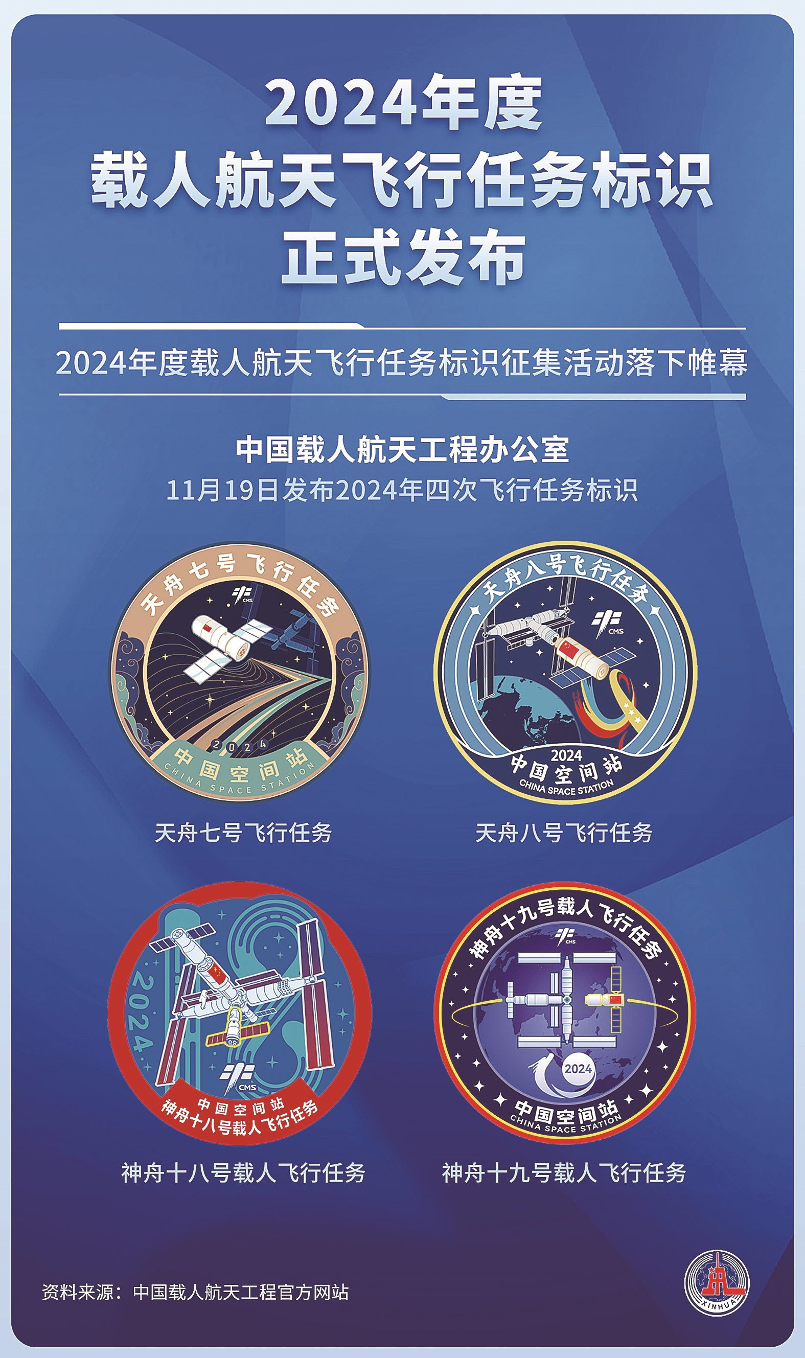 11月19日,中国载人航天工程办公室发布2024年度天舟七号货运飞船、神舟十八号载人飞船、天舟八号货运飞船、神舟十九号载人飞船四次飞行任务标识。