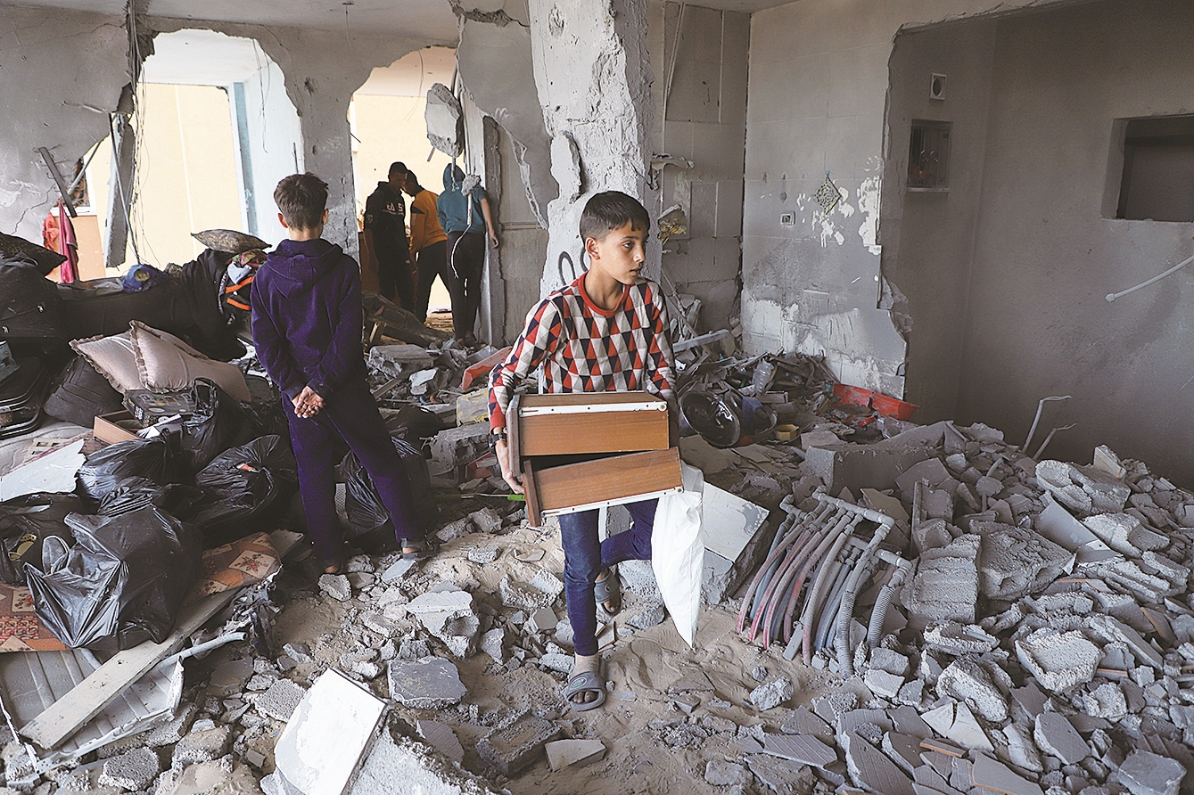 11月22日,在加沙地带南部城市汗尤尼斯,巴勒斯坦人查看遭以色列袭击后的建筑废墟。 新华社发(里泽克·阿卜杜勒贾瓦德 摄)