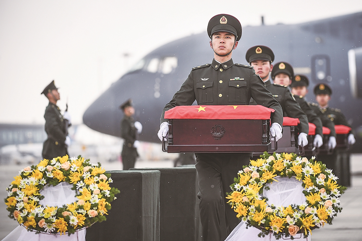 11月23日,在沈阳桃仙国际机场,礼兵将殓放志愿军烈士遗骸的棺椁从专机上护送至棺椁摆放区。