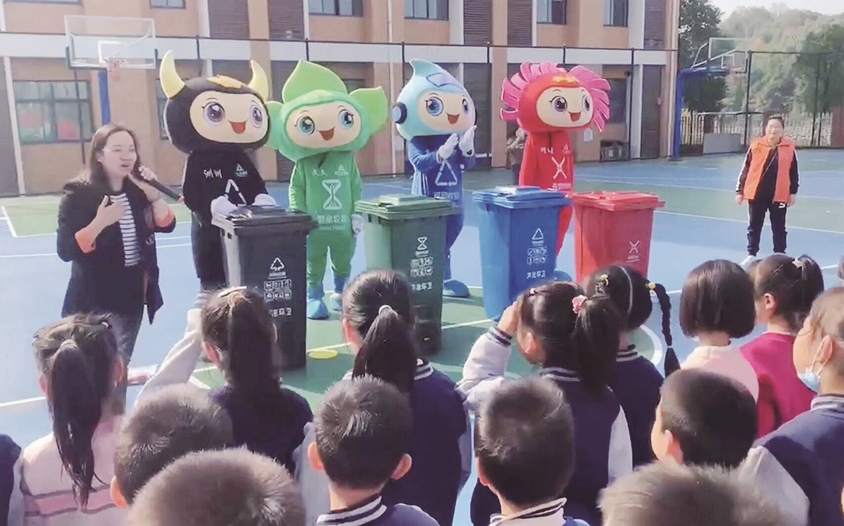 活动现场,卡通玩偶“株株”“洲洲”“文文”“明明”与同学们进行互动,现场教授孩子们垃圾分类的要求和原则,鼓励家长和学生们同心协力,争做文明城市创建的“行动派”。
